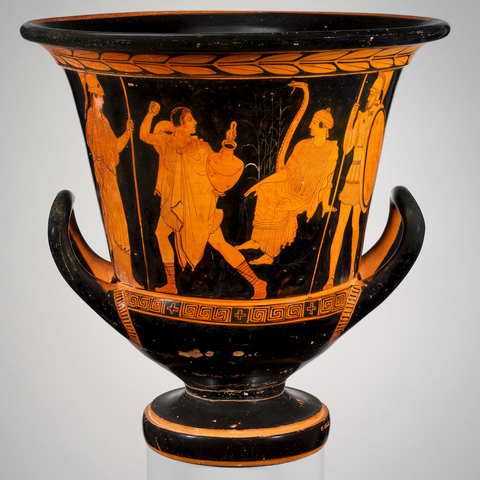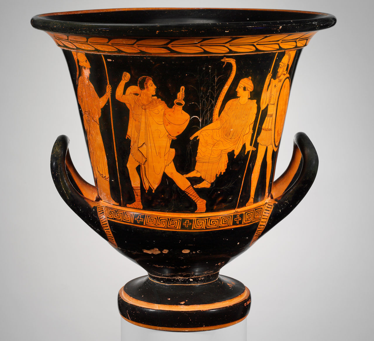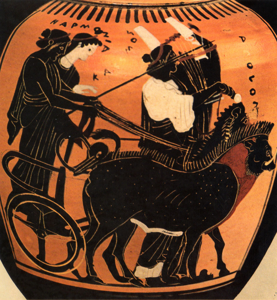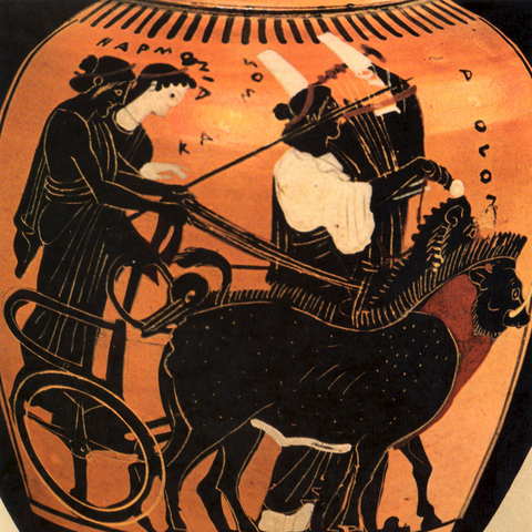 Στον γάμο αυτό [του Κάδμου και της Αρμονίας] παρακάθισαν για πρώτη φορά σε γαμήλιο γεύμα οι θεοί, και η Δήμητρα, που ερωτεύτηκε τον Ιασίονα, του χάρισε τον καρπό του σιταριού, ο Ερμής τη λύρα, η Αθηνά το περίφημο περιδέραιο και πέπλο και αυλούς και η Ηλέκτρα τα μυστήρια της λεγόμενης μεγάλης μητέρας των θεών που τελούνται με κύμβαλα[22] και τύμπανα και ό,τι άλλο ταιριάζει στις οργιαστικές τελετές· και ο Απόλλωνας έπαιξε κιθάρα και οι Μούσες τον αυλό και οι άλλοι θεοί με λέξεις ευοίωνες[23] συνεργούσαν για την ευγονία αυτού του γάμου. (Διόδ. Σ., 5.49.1)
