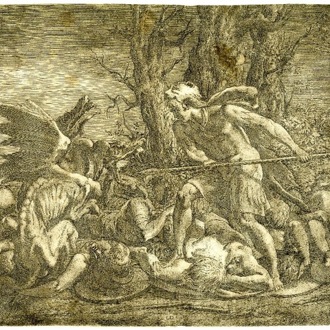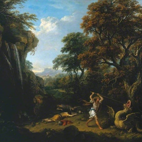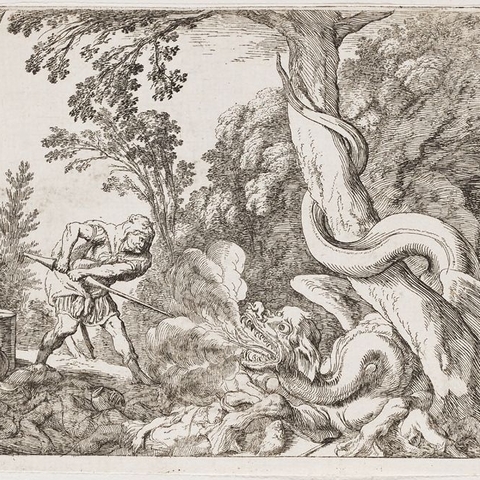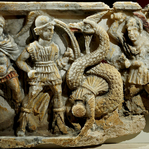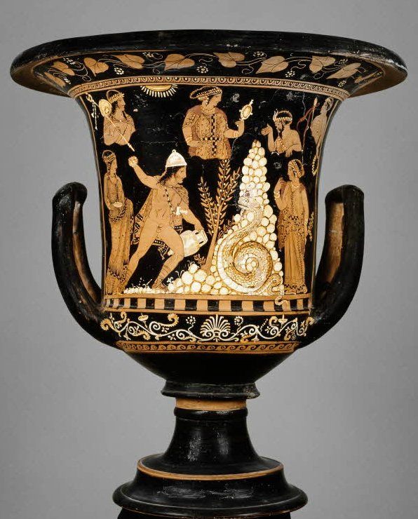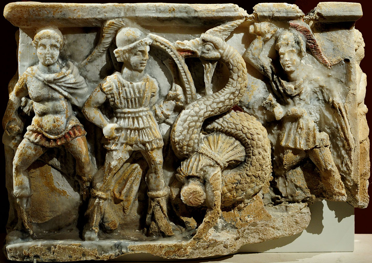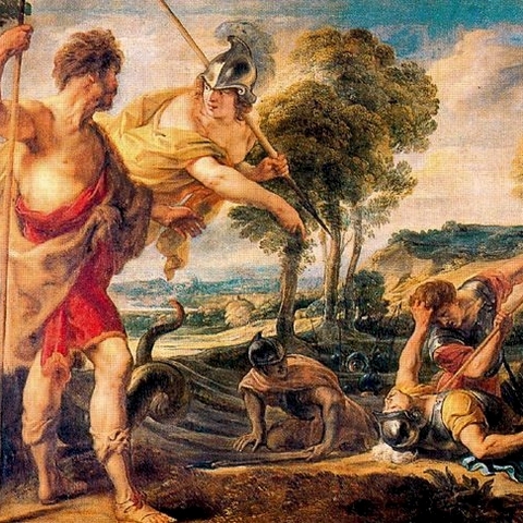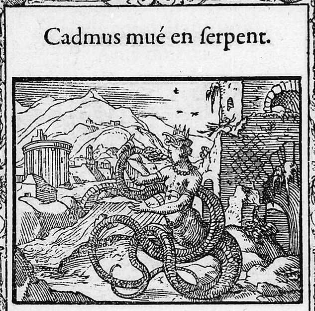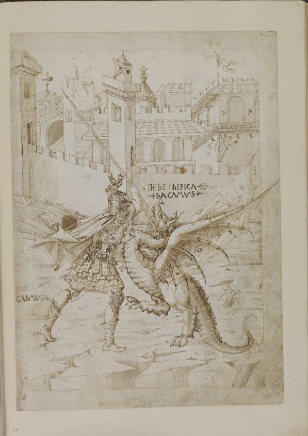 β) Το ζώο έπρεπε να θυσιαστεί. Για τη θυσία χρειαζόταν νερό για τον καθαρμό του ζώου και των συμμετεχόντων στη θυσία. Όμως το νερό της μοναδικής πηγής της περιοχής, που ονομαζόταν Πηγή του Άρη, το φυλούσε ένας δράκος από τη γενιά του Άρη, εξού και το όνομα της πηγής. Ο Κάδμος σκότωσε τον δράκοντα, που είχε στο μεταξύ εξοντώσει όλους τους απεσταλμένους του, και καθ' υπόδειξη της Αθηνάς, προς τιμή της οποίας θα θυσίαζε την αγελάδα, (Εικ. 1207, 1208, 1209, 1210, 1211, 1212, 1213, 1214, 1215, 1216, 1217, 1218, 1219, 1220, 1221, 1222, 1223) έσπειρε τα δόντια του δράκου από τα οποία προέκυψαν σπαρμένοι άνδρες, οι Σπαρτοί. (Εικ. 1224) Αυτά τα αυτόχθονα δημιουργήματα της γης των Θηβών ήταν απειλητικά. Όμως, και σε αυτή την περίπτωση απέναντι στη βία ορθώθηκε η ευφυΐα του Κάδμου. Έριξε πέτρες ανάμεσά τους κι εκείνοι, μη γνωρίζοντας τον υπαίτιο, αλληλοκατηγορήθηκαν και τελικά αλληλοσκοτώθηκαν εκτός από πέντε, τον Χθόνιο, τον Ουδαίο, τον Πέλωρο, τον Υπερήνορα και τον Εχίονα. (Εικ. 1225, 1226) Το γένος των Καδμείων, και των Λαβδακιδών μεταγενέστερα, προήλθαν από τους γάμους Σπαρτών ή απογόνων των Σπαρτών με απογόνους του Κάδμου· για παράδειγμα, η κόρη του Κάδμου Αγαύη παντρεύτηκε τον Σπαρτό Εχίονα, η εγγονή του Σπαρτού Χθόνιου Νυκτηίς τον Καδμείο Πολύδωρο.