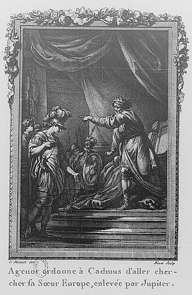 Μετά την απαγωγή της αδελφής τους Ευρώπης από τον Δία, (Εικ. 1193, 1194, 1195, 1196, 1197, 1198, 1199, 1200, 1201, 1202, 1203) ο πατέρας τους Αγήνορας ζήτησε από τα αρσενικά παιδιά του να τη βρουν και να τη φέρουν πίσω. (Εικ. 1204) Τους ακολούθησε η μητέρα τους Τηλέφασσα. Οι αδελφοί του Κάδμου εγκατέλειψαν την προσπάθεια ανεύρεσης της κόρης και εγκαταστάθηκαν σε περιοχές ως οικιστές και επώνυμοι ήρωες. Ο Κάδμος και η Τηλέφασσα έγιναν ευνοϊκά δεκτοί από τους Θρακιώτες. Εκεί, στη Σαμοθράκη, τελέστηκε και ο γάμος του με την Αρμονία.