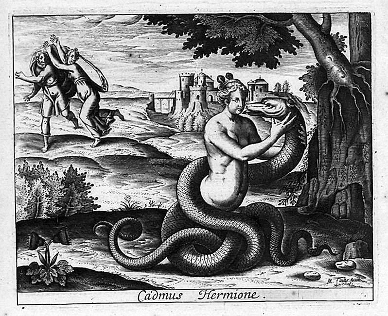 γ) Ο Κάδμος έπρεπε να καθαρθεί για τον φόνο που είχε διαπράξει, και μάλιστα φόνο του απογόνου ενός θεού. Σε αυτόν τον θεό υπηρέτησε ως δούλος για οκτώ χρόνια και μετά ανέλαβε τη βασιλεία στη Θήβα έχοντας την εύνοια της Αθηνάς αλλά και του Δία που του έδωσε γυναίκα την κόρη του Άρη και της Αφροδίτης (θηβαϊκή παράδοση), ή του Δία και της Ηλεκτρυώνης/Ηλέκτρας, κόρης του Άτλαντα (παράδοση της Σαμοθράκης). (Εικ. 1227, 1228)