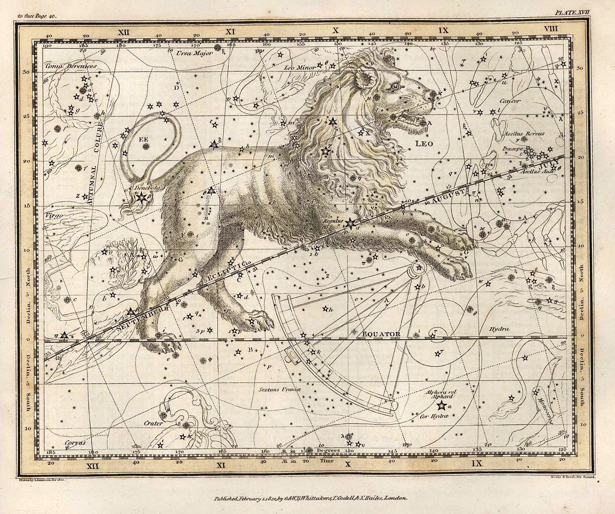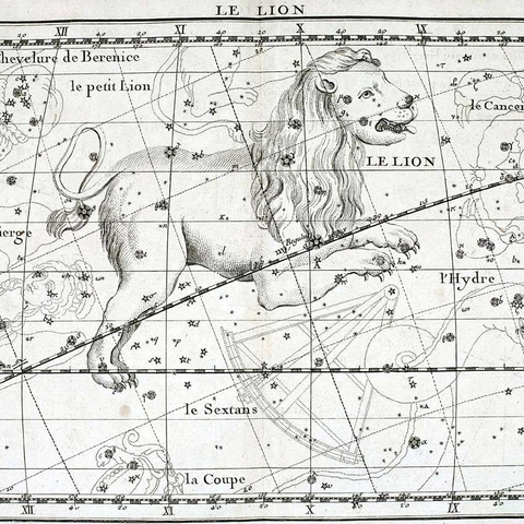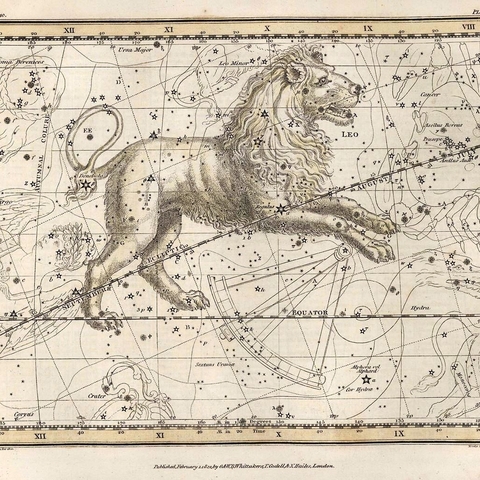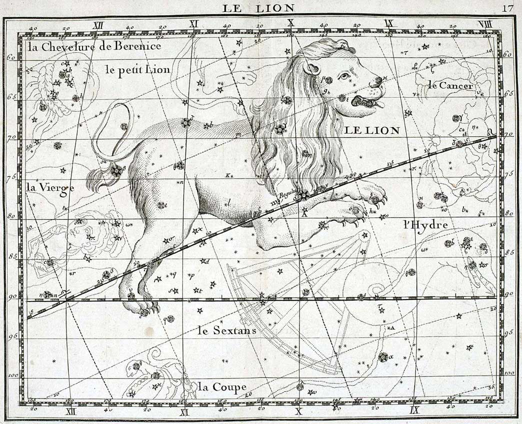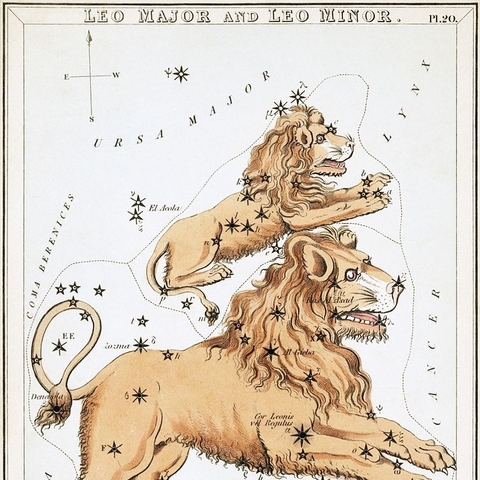 Πρόκειται για το λιοντάρι της Νεμέας που ο Ηρακλής κατάφερε να καθυποτάξει και να σκοτώσει. Οι θεοί θέλοντας να τιμήσουν τον ήρωα και να θυμίζουν αιώνια στους ανθρώπους την ευγνωμοσύνη που του οφείλουν ανέβασαν τον Λέοντα στον ουρανό κάνοντάς τον αστερισμό. Παραθέτουμε την αφήγηση του Απολλοδώρου (2.5.1) για τον πρώτο άθλο του Ηρακλή παρεμβάλλοντας πληροφορίες και από άλλους συγγραφείς: Αυτός [ο Ευρυσθέας] λοιπόν στην αρχή τον διέταξε να του φέρει τη δορά από το λιοντάρι της Νεμέας· επρόκειτο για ζώο άτρωτο, που είχε γεννηθεί από τον Τυφώνα. Άλλοτε, πάλι, λέγεται γιος του Όρθρου και της Έχιδνας, αδελφός της Σφίγγας των Δελφών. Το ανέθρεψε η Ήρα (ή η Σελήνη που το παραχώρησε στην Ήρα) και το άφησε ελεύθερο στα δάση της Νεμέας, όπου προξενούσε μεγάλες καταστροφές σε κοπάδια και ανθρώπους, με αποτέλεσμα η όλη η περιοχή να ερημώνει εξαιτίας του. Πηγαίνοντας λοιπόν για το λιοντάρι [ο Ηρακλής], ήλθε στις Κλεωνές (πάνω στον δρόμο από το Άργος για την Κόρινθο), και εκεί φιλοξενήθηκε από τον Μόλορχο, ένα φτωχό χειρώνακτα. Και καθώς εκείνος ετοιμαζόταν να θυσιάσει ένα σφάγιο, το μοναδικό κριάρι και το μοναδικό αγαθό που είχε, ο Ηρακλής του είπε να το φυλάξει για τριάντα μέρες, και αν επιστρέψει σώος, να το θυσιάσει στον Δία σωτήρα, αν όμως πεθάνει, να το προσφέρει[31]σε αυτόν τιμώντας τον σαν νεκρό ήρωα. Όταν έφτασε στη Νεμέα, αναζήτησε το λιοντάρι· πρώτα το χτύπησε με τα βέλη του, όταν όμως κατάλαβε ότι ήταν άτρωτο, σήκωσε το ρόπαλο και το κυνήγησε. Κυνηγημένο από τον Ηρακλή, κατέφυγε σε σπηλιά που είχε δύο ανοίγματα· τότε εκείνος έχτισε τη μία είσοδο, μπήκε από την άλλη και επιτέθηκε στο θηρίο, έβαλε το χέρι του γύρω από τον λαιμό του και το έσφιξε μέχρι που το έπνιξε· ύστερα, το φόρτωσε στους ώμους του και το έφερε στις Κλεωνές, φορώντας το δέρμα του ζώου. Εκεί βρήκε τον Μόλορχο να ετοιμάζεται την τελευταία μέρα να θυσιάσει το σφάγιο προς τιμή του, νομίζοντάς τον πια για νεκρό, θυσίασε στον Δία σωτήρα και στη συνέχεια μετέφερε το λιοντάρι στις Μυκήνες. Έκπληκτος ο Ευρυσθέας από την τόλμη του, του απαγόρευσε στο εξής να μπαίνει μέσα στην πόλη και του έδωσε την εντολή να επιδεικνύει τα αποτελέσματα των άθλων του μπροστά από τις πύλες. Λένε μάλιστα ότι φοβήθηκε τόσο που κατασκεύασε για τον εαυτό του ένα χάλκινο πιθάρι, που το έχωσε κάτω από το γη, και ότι του παράγγελνε τους άθλους στέλνοντάς του για κήρυκα τον Κοπρέα, γιο του Πέλοπα από την Ηλεία.