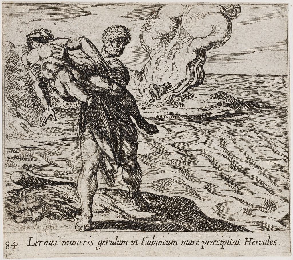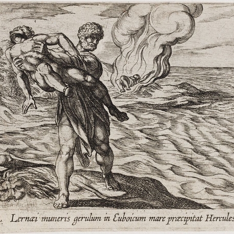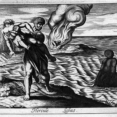 Όταν έφτασε στην Τραχίνα [ο Ηρακλής], συγκέντρωσε στρατό για να επιτεθεί στην Οιχαλία, επειδή ήθελε να τιμωρήσει τον Εύρυτο. Μαζί του πολέμησαν οι Αρκάδες και οι Μηλιείς από την Τραχίνα και οι Επικνημίδιοι Λοκροί, σκότωσε τον Εύρυτο και τα παιδιά του και κυρίευσε την πόλη. Και αφού έθαψε όσους από τους συμπολεμιστές του είχαν πεθάνει, […] λαφυραγώγησε την πόλη και πήρε αιχμάλωτη την Ιόλη. Και αφού προσάραξε στο Κήναιο της Εύβοιας, ίδρυσε στο ακρωτήριο βωμό προς τιμή του Δία Κηναίου. Και επειδή θέλησε να προσφέρει θυσία, έστειλε στην Τραχίνα τον κήρυκα <Λίχα> να του φέρει λαμπρή φορεσιά [χιτώνα και ιμάτιο φορούσαν στις θυσίες]. Όταν η Δηιάνειρα έμαθε από αυτόν για την Ιόλη, επειδή φοβήθηκε μήπως αγαπήσει περισσότερο εκείνη και επειδή θεώρησε ότι το αίμα του Νέσσου που είχε τρέξει ήταν στ' αλήθεια φίλτρο ερωτικό, επάλειψε μ' αυτό τον χιτώνα. Τον φόρεσε ο Ηρακλής και άρχισε τη θυσία. Αλλά μόλις ο χιτώνας πήρε να θερμαίνεται, το δηλητήριο της ύδρας άρχισε να του σαπίζει το δέρμα, και αρπάζοντας τον Λίχα από τα πόδια, τον εκσφενδόνισε […]. (Απολλόδωρος 2.156-158)