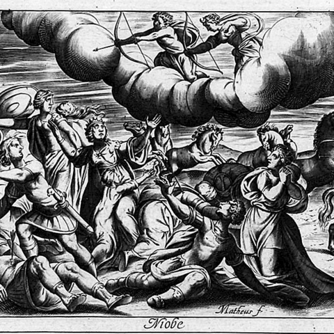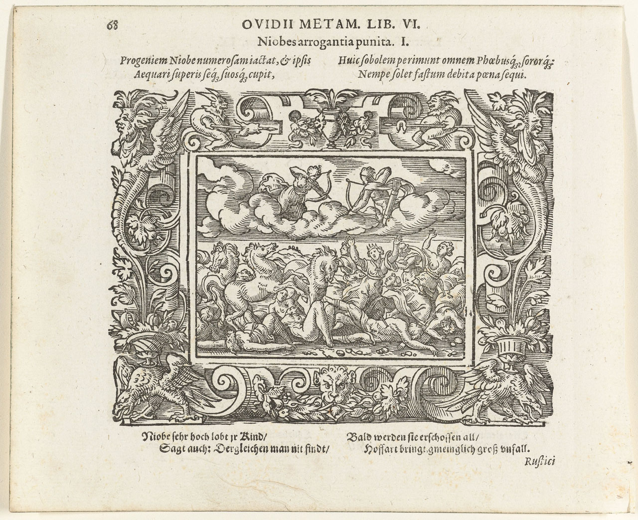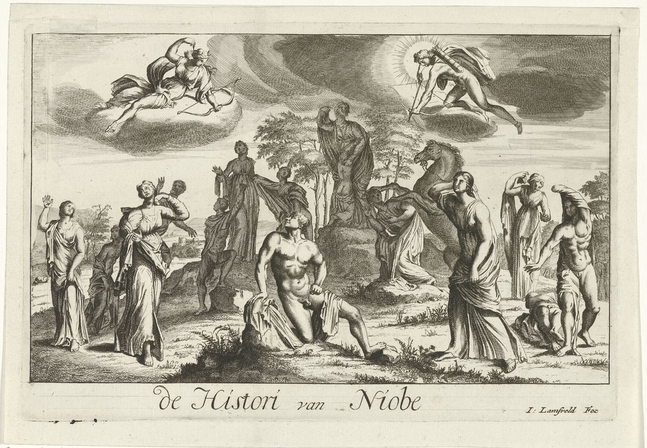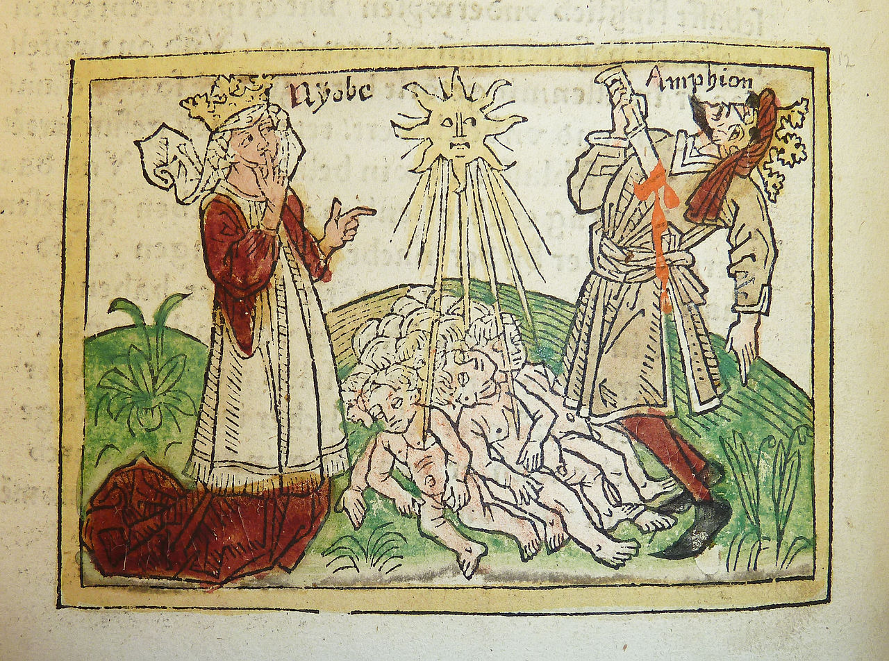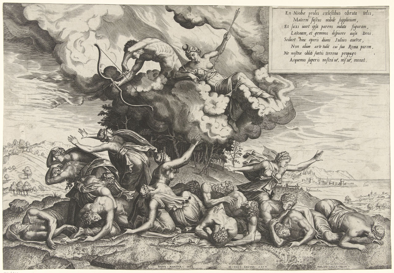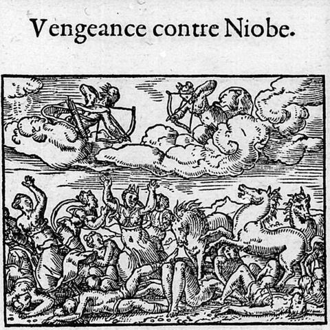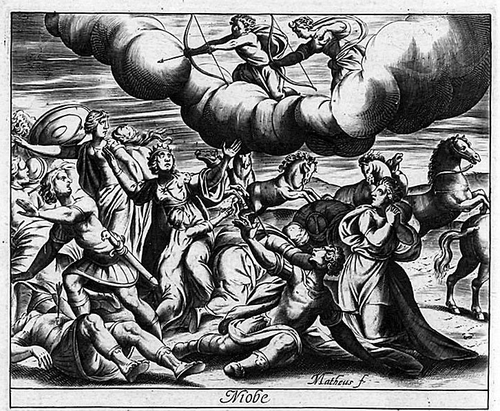 Και η ιστορία της Νιόβης είναι μια ιστορία αλαζονείας θνητού ανθρώπου που προσπάθησε να συγκριθεί με τους θεούς. Η τιμωρία ήρθε θυμίζοντας στους βροτούς πόσο πρόσκαιρη μπορεί να είναι η ευτυχία τους σε αντίθεση με τη διαρκή και αιώνια μακαριότητα των θεών. Περήφανη για την ευγονία της και για την ομορφιά των παιδιών της τόλμησε να συγκριθεί με τη Λητώ που είχε μόνο ένα ζεύγος διδύμων, την Άρτεμη και τον Απόλλωνα. Η οργή της Λητώς κίνησε εναντίον της Νιόβης τα παιδιά της που με τα βέλη τους η μεν Άρτεμη χτύπησε τις κόρες της Νιόβης μέσα στο σπίτι τους, ο δε Απόλλωνας τους γιους της, καθώς κυνηγούσαν στον Κιθαιρώνα. (και Διόδ. Σ. 4.74.3) (Εικ. 1511, 1512, 1513, 1514, 1515, 1516, 1517, 1518, 1519, 1520, 1521, 1522, 1523, 1524, 1525, 1526, 1527, 1528, 1529, 1530, 1531, 1532, 1533, 1534, 1535)