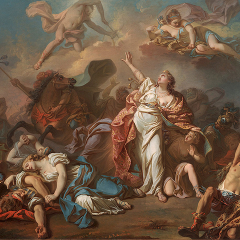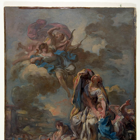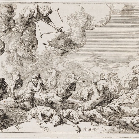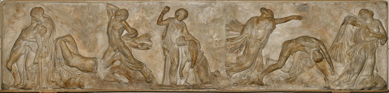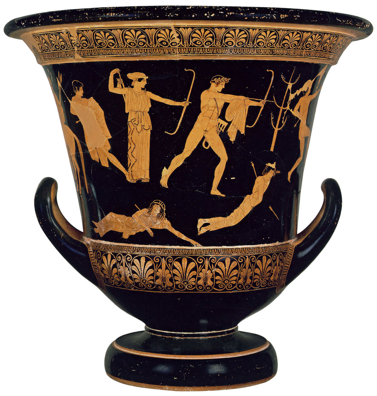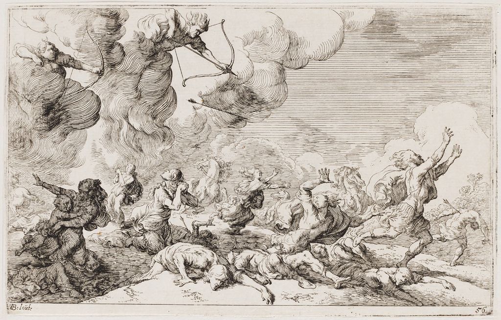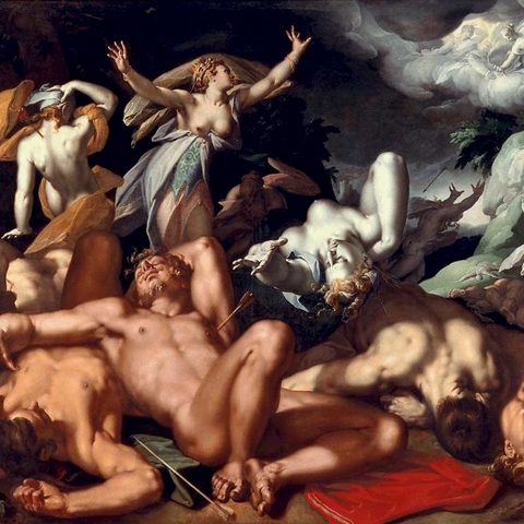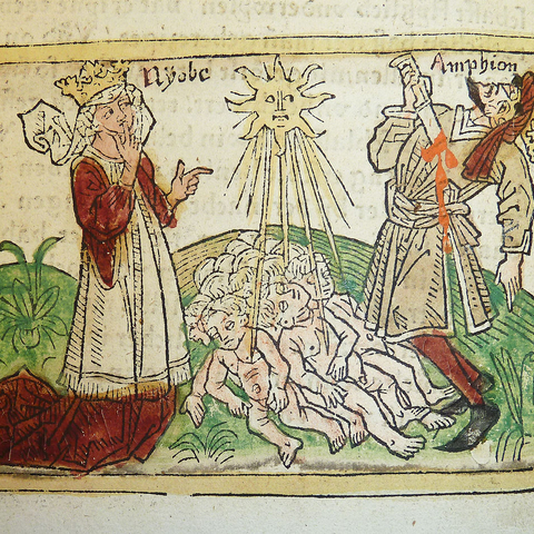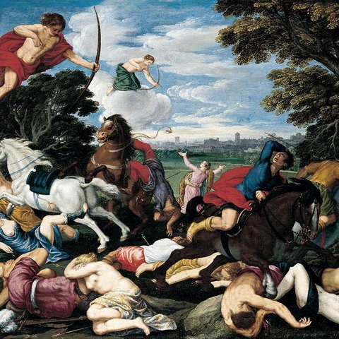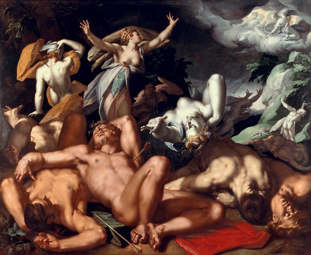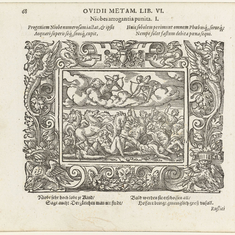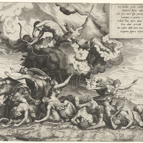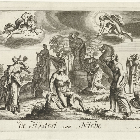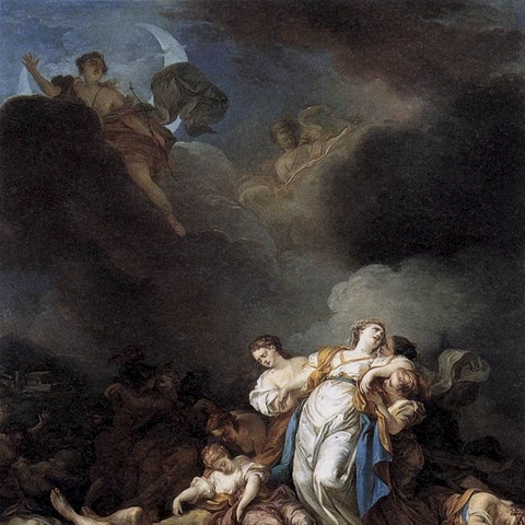 Και η ιστορία της Νιόβης είναι μια ιστορία αλαζονείας θνητού ανθρώπου που προσπάθησε να συγκριθεί με τους θεούς. Η τιμωρία ήρθε θυμίζοντας στους βροτούς πόσο πρόσκαιρη μπορεί να είναι η ευτυχία τους σε αντίθεση με τη διαρκή και αιώνια μακαριότητα των θεών. Περήφανη για την ευγονία της και για την ομορφιά των παιδιών της τόλμησε να συγκριθεί με τη Λητώ που είχε μόνο ένα ζεύγος διδύμων, την Άρτεμη και τον Απόλλωνα. Η οργή της Λητώς κίνησε εναντίον της Νιόβης τα παιδιά της που με τα βέλη τους η μεν Άρτεμη χτύπησε τις κόρες της Νιόβης μέσα στο σπίτι τους, ο δε Απόλλωνας τους γιους της, καθώς κυνηγούσαν στον Κιθαιρώνα. (και Διόδ. Σ. 4.74.3) (Εικ. 1511, 1512, 1513, 1514, 1515, 1516, 1517, 1518, 1519, 1520, 1521, 1522, 1523, 1524, 1525, 1526, 1527, 1528, 1529, 1530, 1531, 1532, 1533, 1534, 1535)