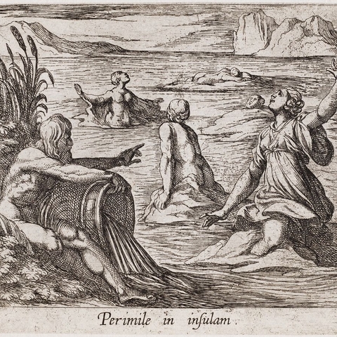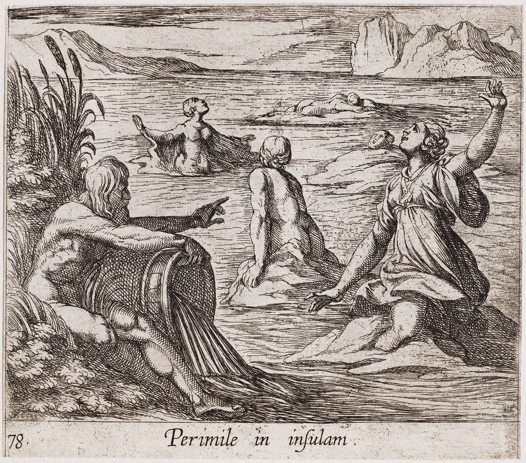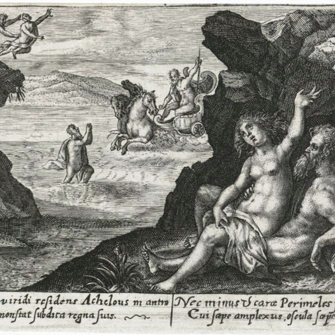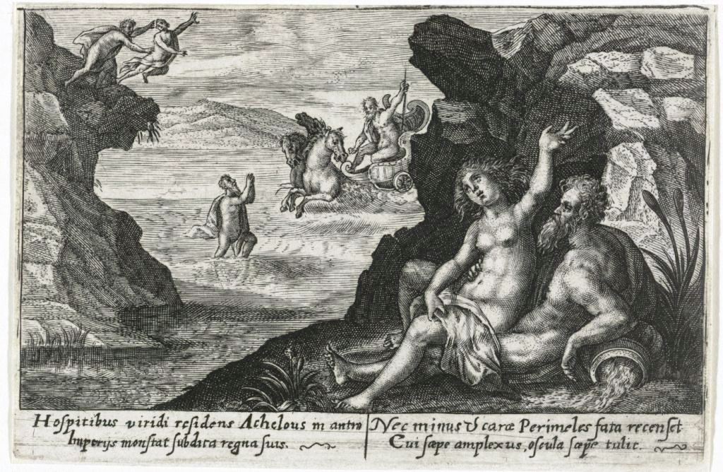 Όταν τέσσερις Νύμφες θυσίαζαν στις όχθες του ποταμού Αχελώου, λησμόνησαν να επικαλεστούν τον θεό-ποταμό. Οργισμένος ο θεός ανέβασε τα νερά του και τις παρέσυρε στη θάλασσα, όπου έγιναν νησιά -οι Εχινάδες Νήσοι. Επειδή όμως τα νησιά είναι πέντε, ο μύθος συμπληρώνει ότι το πέμπτο νησί ήταν μια κοπέλα, η Περιμήλη, την οποία διέφθειρε ο Αχελώος. Όταν ο πατέρος της Ιπποδάμας, θυμωμένος, την έριξε στον ποταμό τη στιγμή που επρόκειτο να φέρει στον κόσμο ένα παιδί, ο Αχελώος ικέτεψε τον Ποσειδώνα να σώσει τη νέα γυναίκα, και εκείνος τη μεταμόρφωσε σε νησί. (Εικ. 1581, 1582, 1583, 1584, 1585)