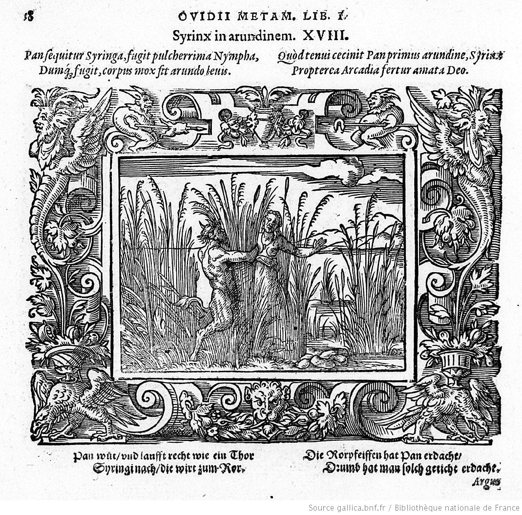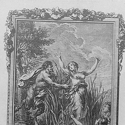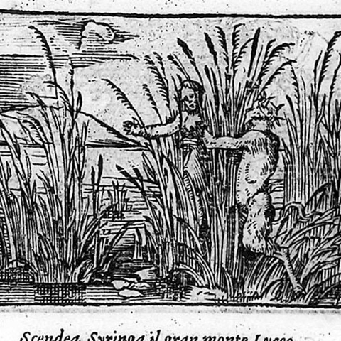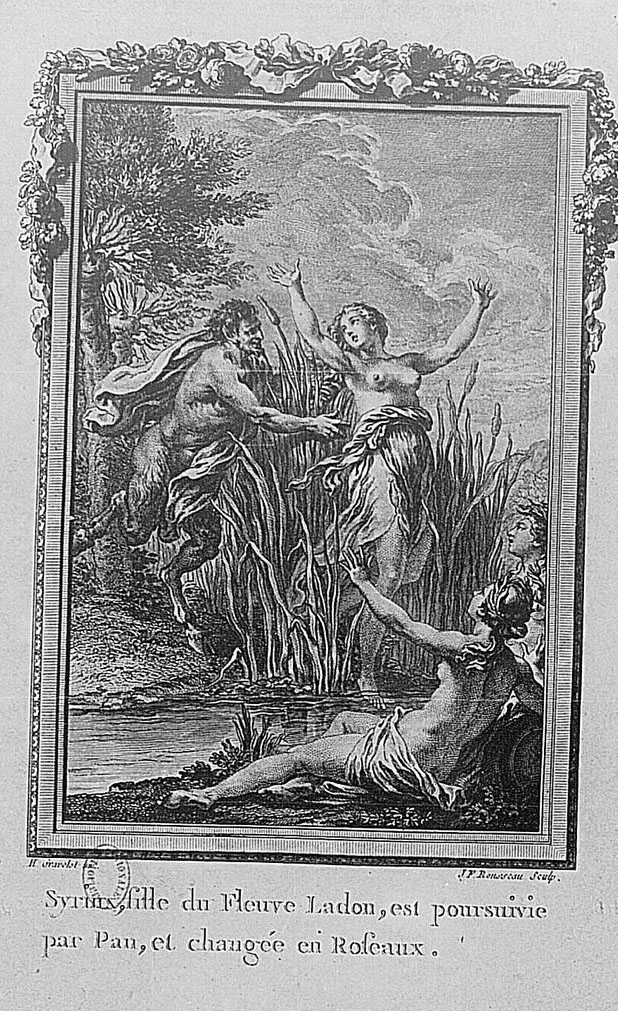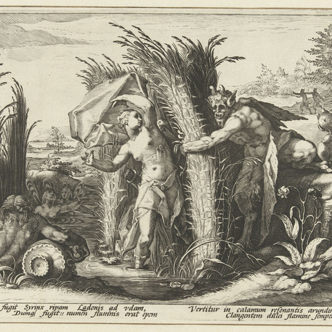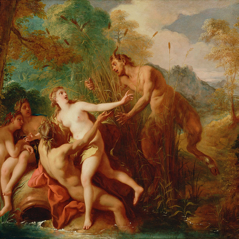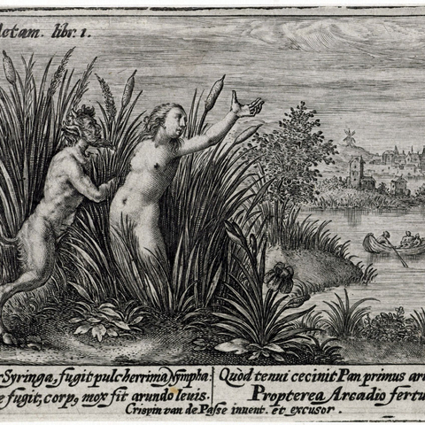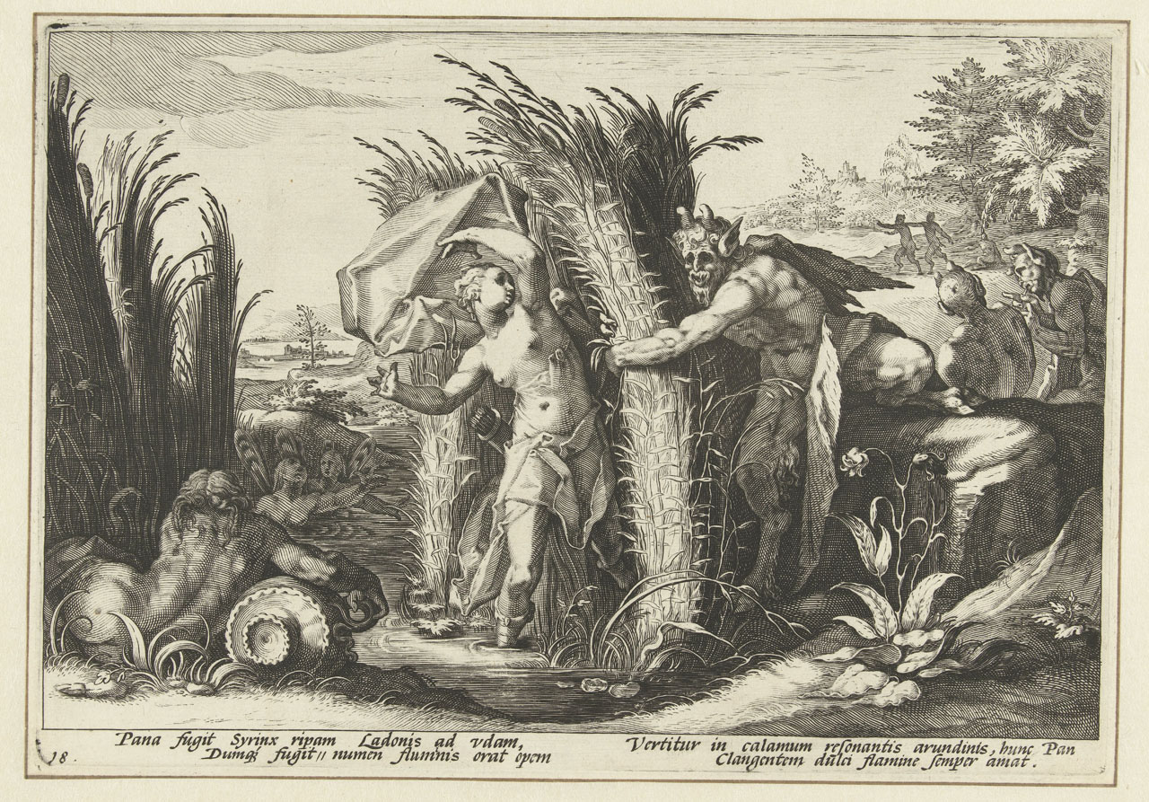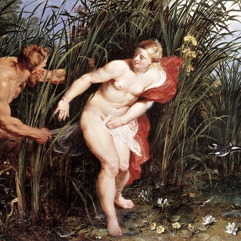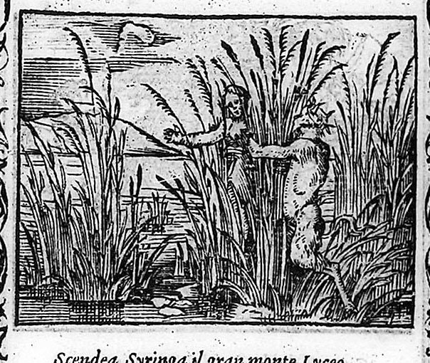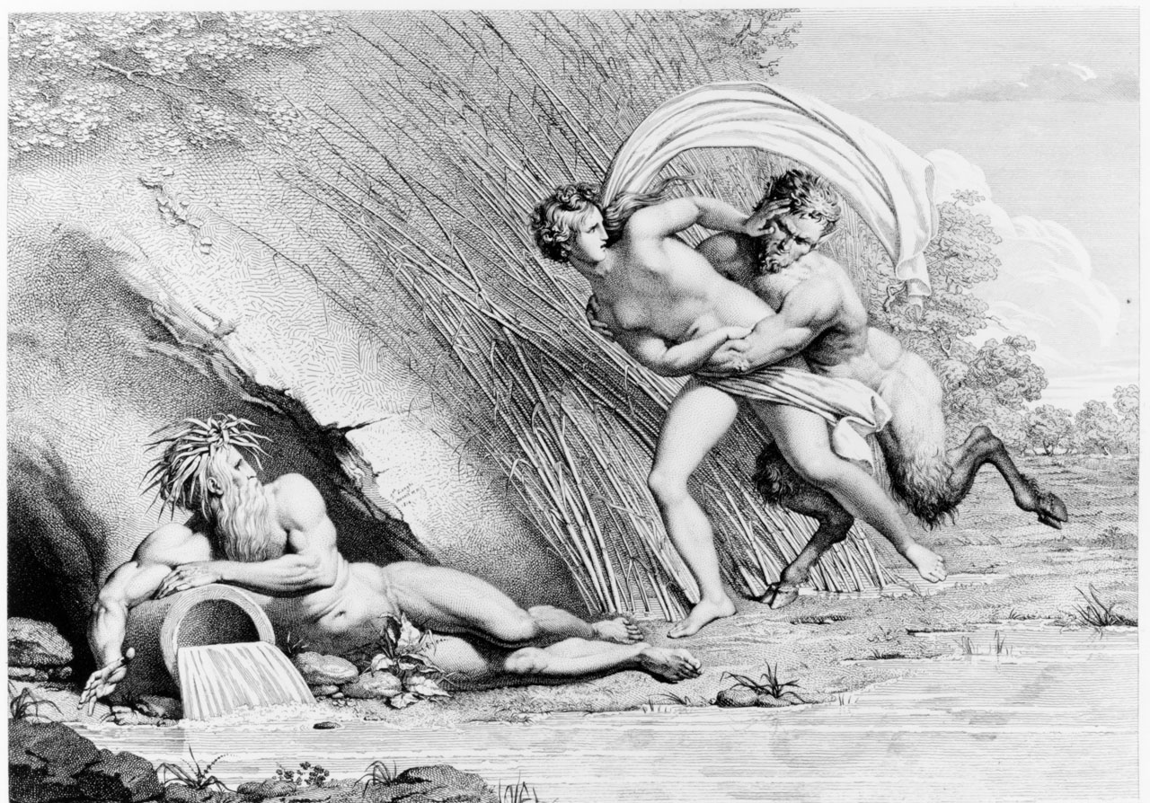 Η Σύριγγα ήταν νύμφη της Αρκαδίας που την ερωτεύτηκε ο Πάνας. Την καταδίωξε για να την πιάσει, αλλά την κρίσιμη στιγμή της σύλληψης εκείνη μεταμορφώθηκε σε καλαμιά στις όχθες του Λάδωνα. Είτε γιατί άκουσε τον ήχο που έκαναν οι καλαμιές, καθώς φυσούσε, είτε γιατί, στην προσπάθειά του να ξεχωρίσει ποια ήταν η κοπέλα, ξερίζωσε, μερικά από αυτά τα καλάμια, διαφορετικά σε μέγεθος το καθένα, και φύσηξε στο εσωτερικό τους. Αυτή η τυχαία ανακάλυψη τον οδήγησε στη συστηματοποίησή της· κόλλησε με κερί καλάμια διαφορετικού μεγέθους το καθένα και έφτιαξε ένα μουσικό όργανο στο οποίο έδωσε το όνομα της χαμένης νύμφης. Με το όργανο αυτό συνοδεύει τον χορό και το τραγούδι των Νυμφών, που κατοικούν σε σπηλιές, συνήθως και με τον Ερμή στην παρέα. Ο Ερμής, εξάλλου, αφηγείται στον Άργο την ιστορία της Σύριγγας, προκειμένου να τον κοιμίσει και να ελευθερώσει την Ιώ.