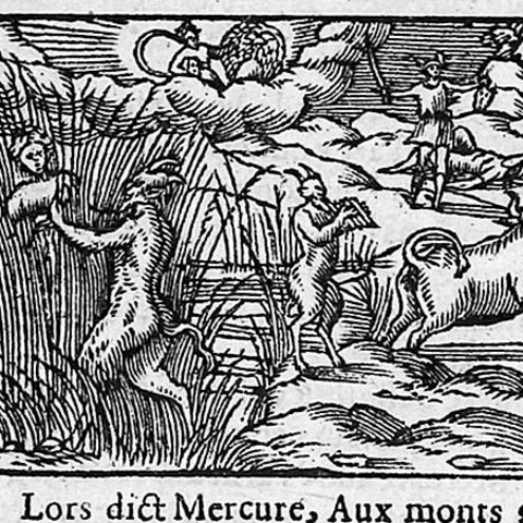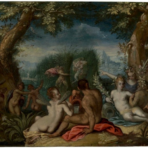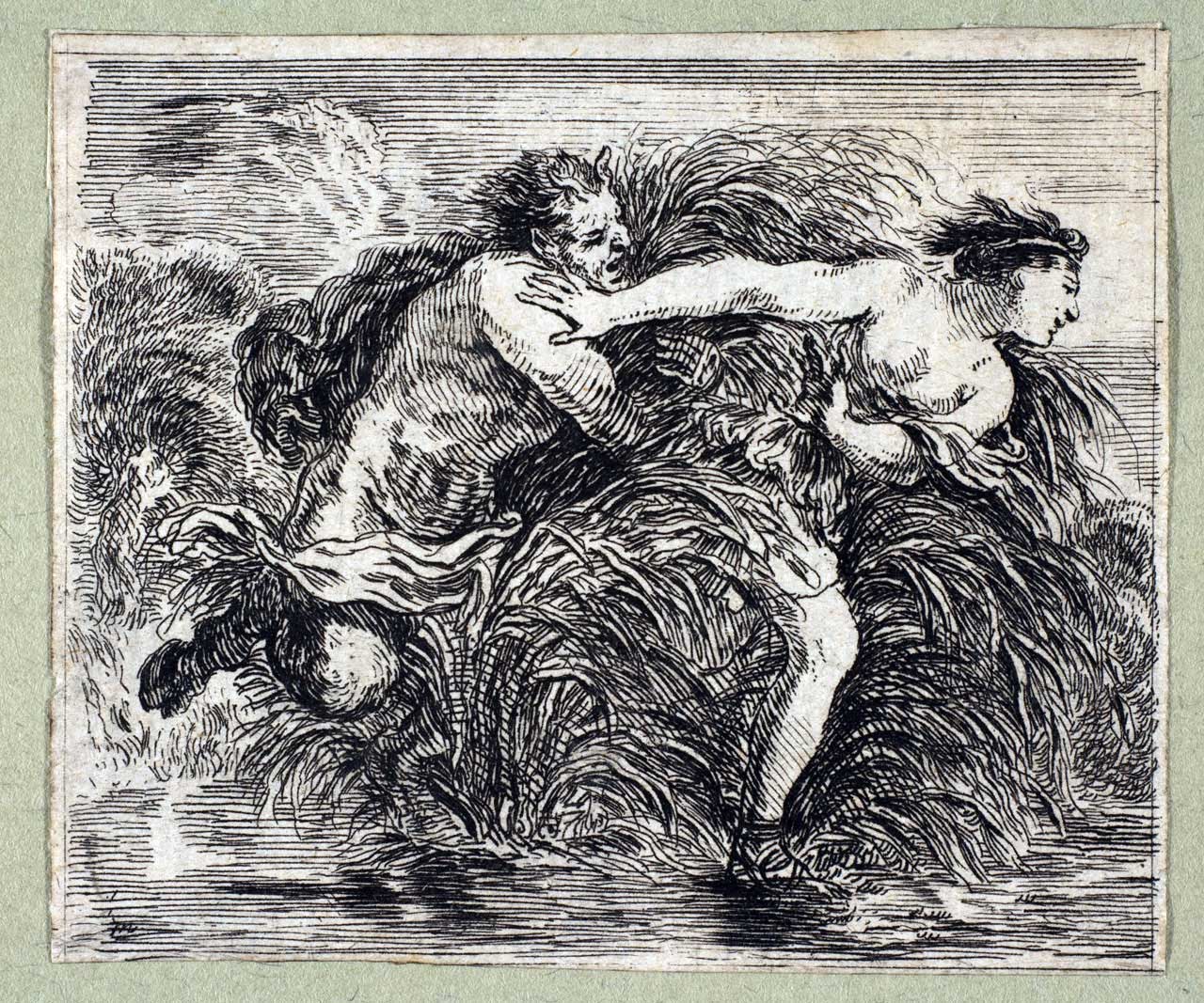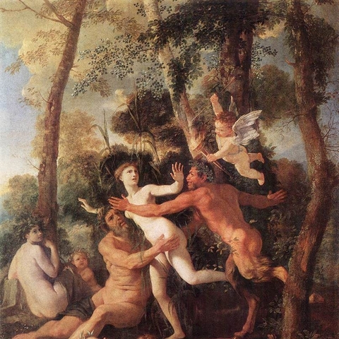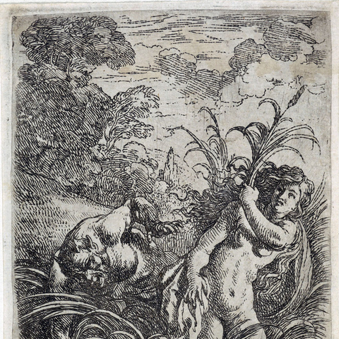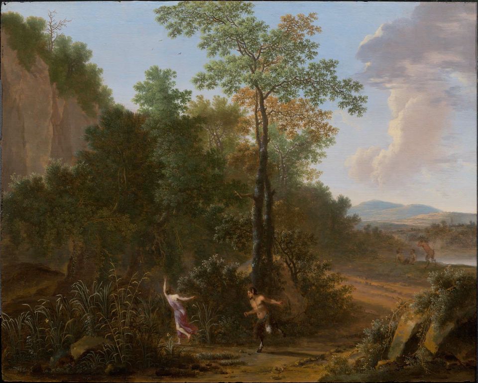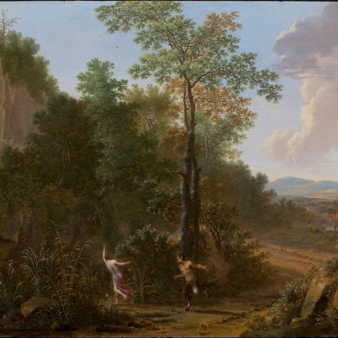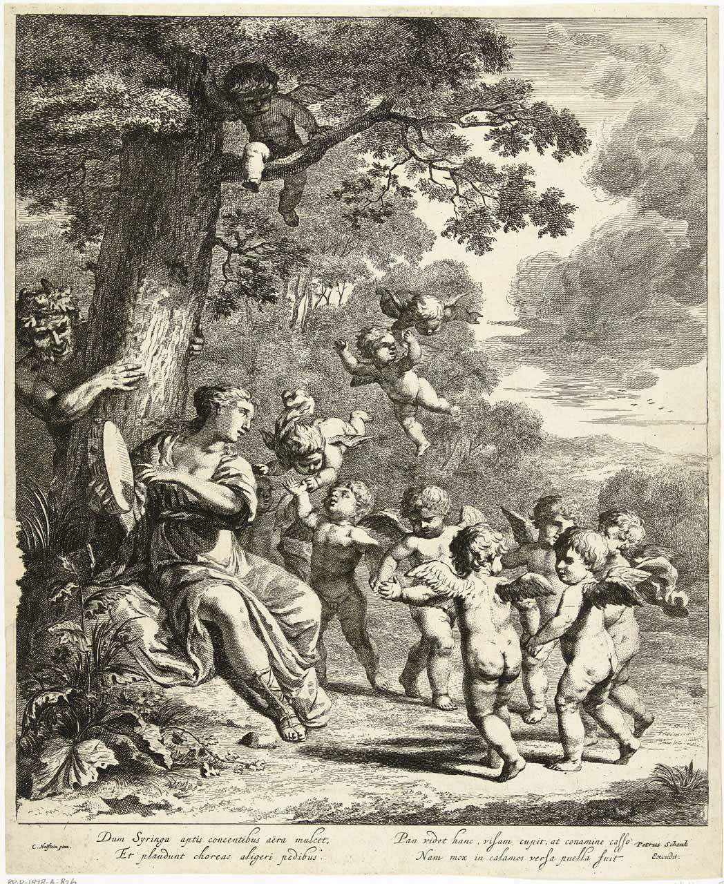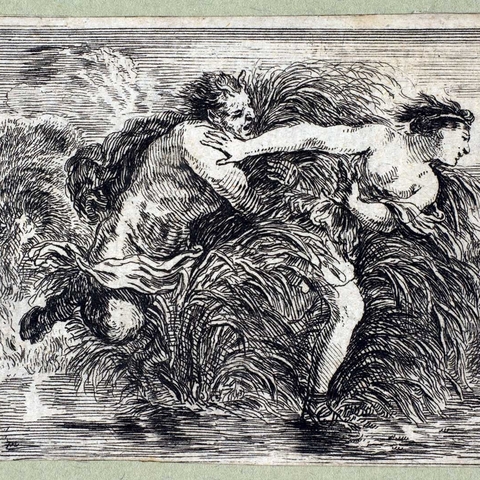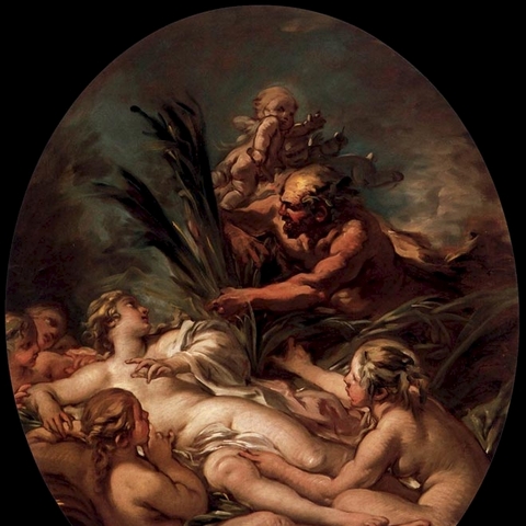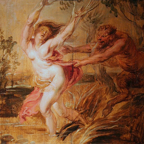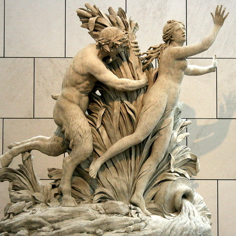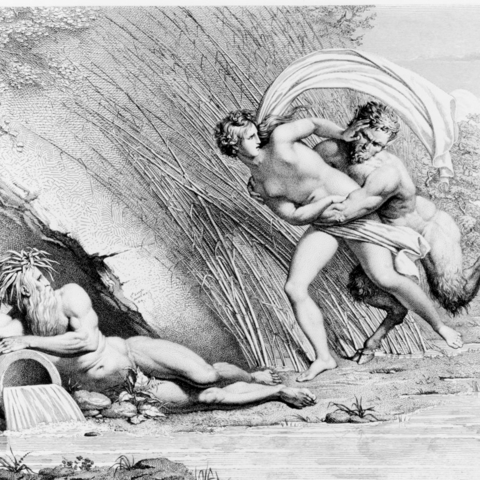 Η Σύριγγα ήταν νύμφη της Αρκαδίας που την ερωτεύτηκε ο Πάνας. Την καταδίωξε για να την πιάσει, αλλά την κρίσιμη στιγμή της σύλληψης εκείνη μεταμορφώθηκε σε καλαμιά στις όχθες του Λάδωνα. Είτε γιατί άκουσε τον ήχο που έκαναν οι καλαμιές, καθώς φυσούσε, είτε γιατί, στην προσπάθειά του να ξεχωρίσει ποια ήταν η κοπέλα, ξερίζωσε, μερικά από αυτά τα καλάμια, διαφορετικά σε μέγεθος το καθένα, και φύσηξε στο εσωτερικό τους. Αυτή η τυχαία ανακάλυψη τον οδήγησε στη συστηματοποίησή της· κόλλησε με κερί καλάμια διαφορετικού μεγέθους το καθένα και έφτιαξε ένα μουσικό όργανο στο οποίο έδωσε το όνομα της χαμένης νύμφης. Με το όργανο αυτό συνοδεύει τον χορό και το τραγούδι των Νυμφών, που κατοικούν σε σπηλιές, συνήθως και με τον Ερμή στην παρέα. Ο Ερμής, εξάλλου, αφηγείται στον Άργο την ιστορία της Σύριγγας, προκειμένου να τον κοιμίσει και να ελευθερώσει την Ιώ.