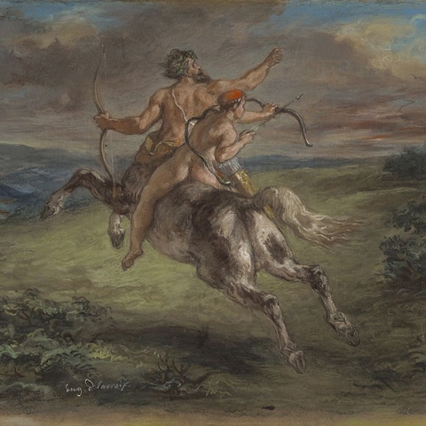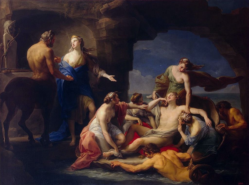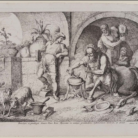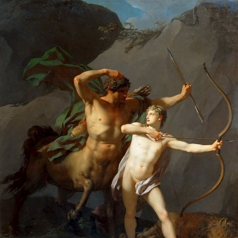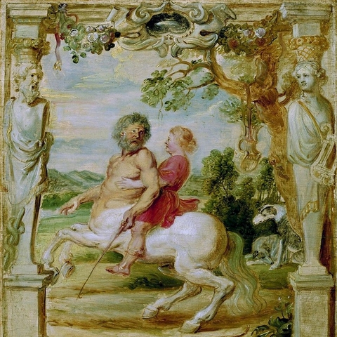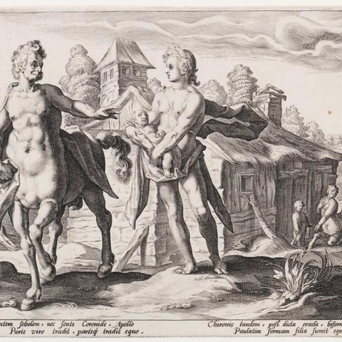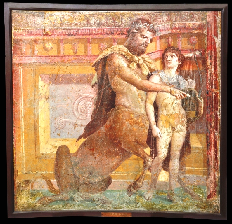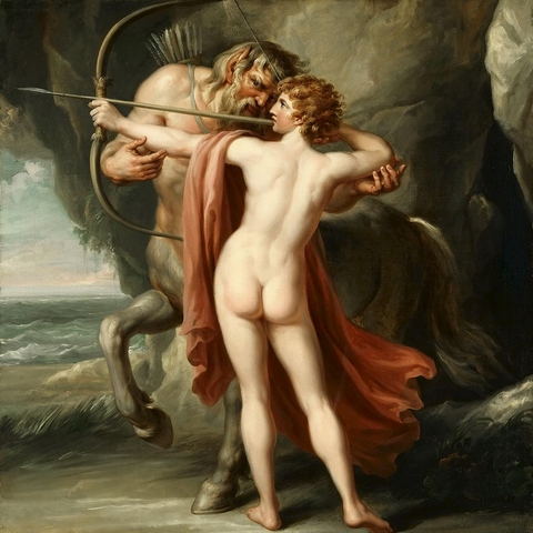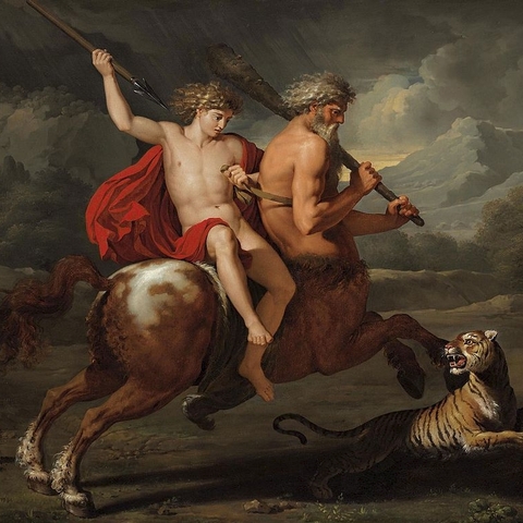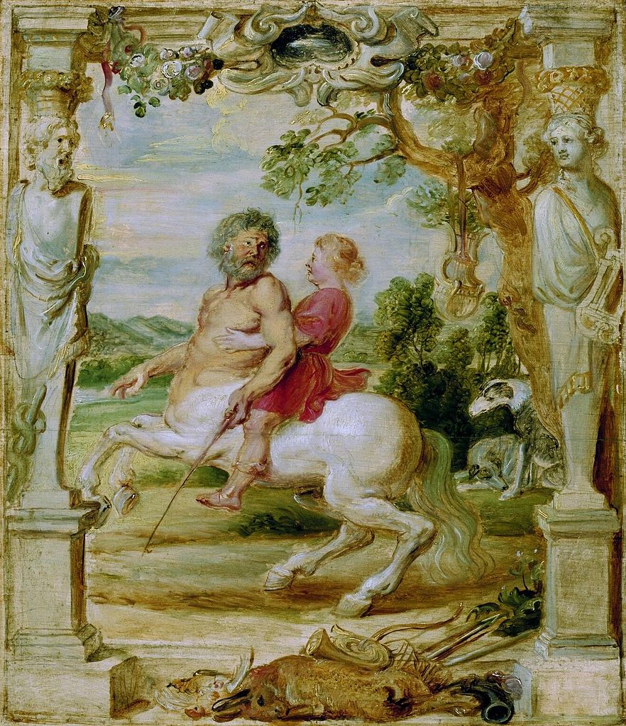 4. Ανέθρεψε τον Αχιλλέα που του τον εμπιστεύτηκε ο Πηλέας, όταν η Θέτιδα έφυγε πίσω στις αδελφές της τις Νηρηίδες, αφήνοντας ημιτελή τη διεργασία που έκανε για να κερδίσει το παιδί τους την αθανασία. Και ο Χείρωνας τον δέχτηκε και τον έτρεφε με σπλάχνα λιονταριών και αγριόχοιρων και με μυαλά αρκούδας, και το ονόμασε Αχιλλέα (πρώτα ονομαζόταν Λιγύρων), επειδή τα χείλη του δεν άγγιξαν μαστό. (Εικ. 1964, 1965, 1966, 1967, 1968, 1969, 1970, 1971, 1972, 1973, 1974, 1975, 1976, 1977, 1978, 1979, 1980)
