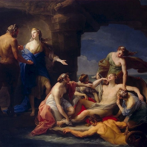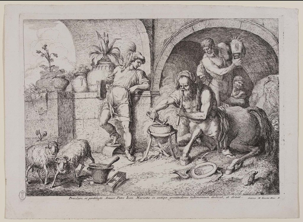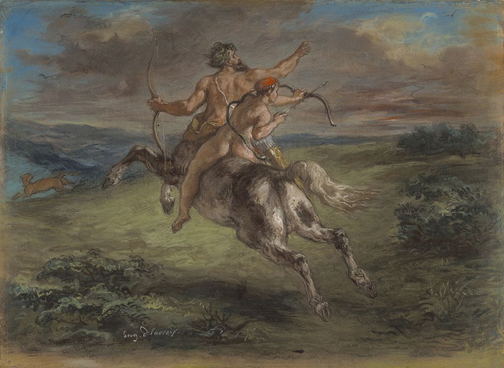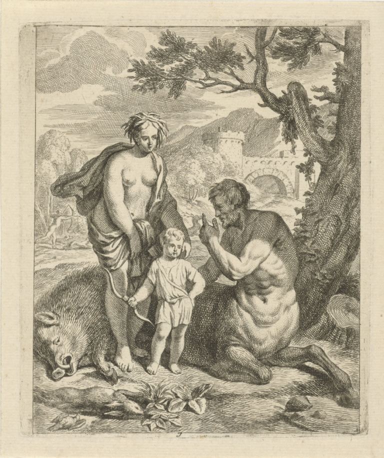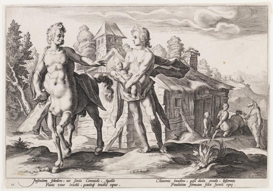 7. Ανέθρεψε και δίδαξε την ιατρική -κυρίως τὴν διὰ τῶν χειρῶν ἐπιμέλειαν- και την τέχνη του κυνηγιού στον Ασκληπιό, γιο του Απόλλωνα και της Κορωνίδας. (Εικ. 597, 598, 599, 600)