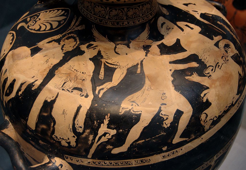 Τέταρτο άθλο του επέβαλε [ο Ευρυσθέας στον Ηρακλή] να φέρει ζωντανό τον Ερυμάνθιο κάπρο· αυτό το θηρίο, έχοντας για ορμητήριο το βουνό που ονομάζεται Ερύμανθος [στην Αρκαδία], κατέβαινε και προκαλούσε πολλές καταστροφές στην Ψωφίδα. Καθώς διέσχιζε τη Φολόη, φιλοξενήθηκε από τον Κένταυρο Φόλο, γιο του Σειληνού και μιας Νύμφης των μελιών [των δέντρων]. Αυτός προσέφερε ψημένα τα κρέατα στον Ηρακλή, ενώ ο ίδιος τα έτρωγε ωμά. Όταν ο Ηρακλής ζήτησε κρασί, απάντησε ότι φοβόταν να ανοίξει πιθάρι που ανήκε σε όλους τους Κενταύρους· με παρότρυνση του Ηρακλή να μην φοβάται, το άνοιξε. Αλλά οι Κένταυροι ένιωσαν τη μυρωδιά και μετά από λίγο έφτασαν στη σπηλιά του Φόλου, οπλισμένοι με πέτρες και έλατα. Τους πρώτους που τόλμησαν να μπουν μέσα, τον Άγχιο και τον Άγριο, ο Ηρακλής τους έτρεψε σε φυγή χτυπώντας τους με δαυλούς, ενώ τους υπόλοιπους τους κυνήγησε τοξεύοντάς τους μέχρι τον Μαλέα. Από εκεί κατέφυγαν στον Χείρωνα που, διωγμένος από τους Λαπίθες από το Πήλιο, κατοικούσε στον Μαλέα. Και καθώς οι Κένταυροι μαζεύτηκαν γύρω του, ο Ηρακλής τους σημάδεψε με το τόξο του και έριξε ένα βέλος που διαπέρασε το μπράτσο του Έλατου και σφηνώθηκε στο γόνατο του Χείρωνα. Φαρμακωμένος ο Ηρακλής από το γεγονός, έτρεξε να τραβήξει το βέλος και έβαλε επάνω στην πληγή ένα φάρμακο που του έδωσε ο Χείρωνας. Επειδή όμως το τραύμα ήταν ανίατο [τα βέλη του Ηρακλή ήταν φαρμακερά], εκείνος αποτραβήχτηκε στο σπήλαιο. Και εκεί, μη μπορώντας να πεθάνει, επειδή ήταν αθάνατος, ο Προμηθέας [που παλιά ήταν θνητός] προσφέρθηκε στον Δία να τον κάνει αθάνατο στη θέση εκείνου· και έτσι πέθανε ο Χείρωνας. (Εικ. 1981) Οι υπόλοιποι Κένταυροι σκόρπισαν· κάποιοι έφτασαν στο όρος Μαλέα, ο Ευρυτίωνας στη Φολόη, ο Νέσσος στον ποταμό Εύηνο. Τους υπόλοιπους τους δέχθηκε ο Ποσειδώνας στην Ελευσίνα και τους σκέπασε με ένα βουνό. Όσο για τον Φόλο, καθώς τράβηξε από ένα σκοτωμένο Κένταυρο το βέλος, απορούσε πώς κάτι τόσο μικρό σκότωσε αυτούς που ήταν τόσο γιγαντόσωμοι· γλίστρησε όμως από το χέρι του, έπεσε στο πόδι του και τον σκότωσε αμέσως. Όταν ο Ηρακλής επέστρεψε στη Φολόη και αντίκρισε νεκρό τον Φόλο, τον έθαψε και στη συνέχεια καταπιάστηκε με το κυνήγι του αγριογούρουνου· (Απολλόδωρος 2.5.4)