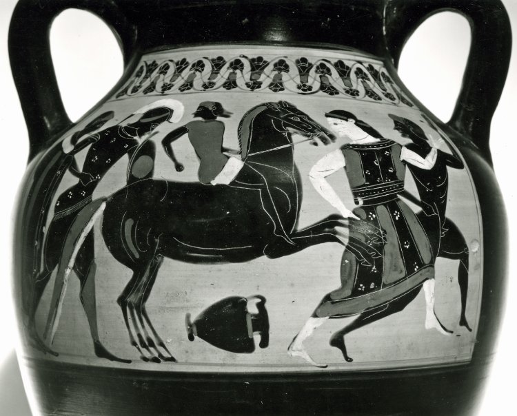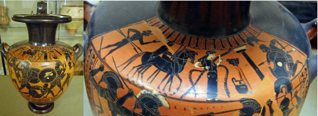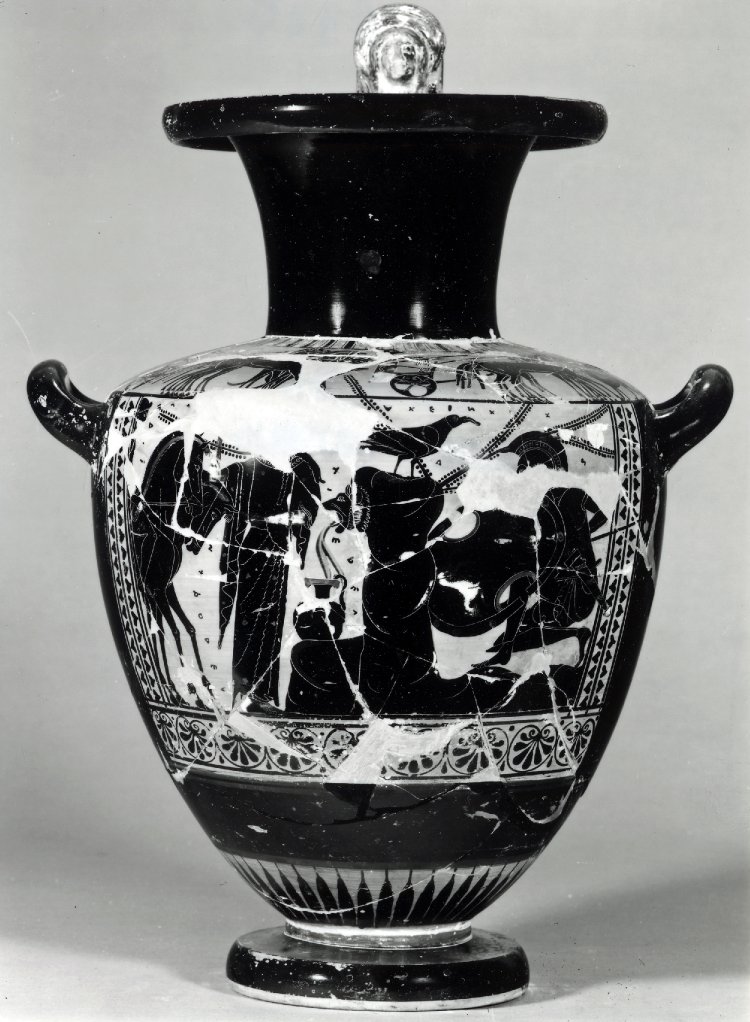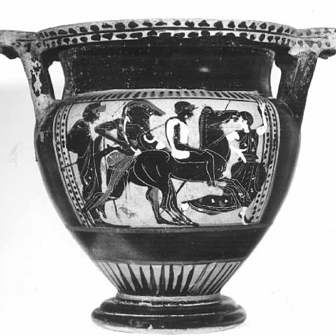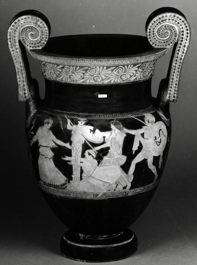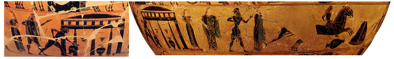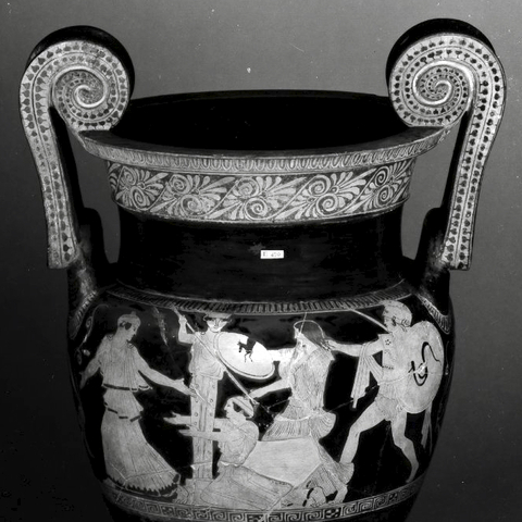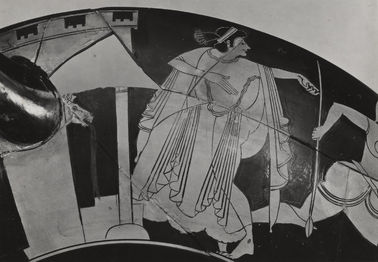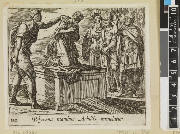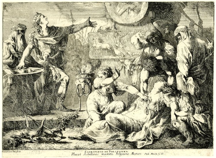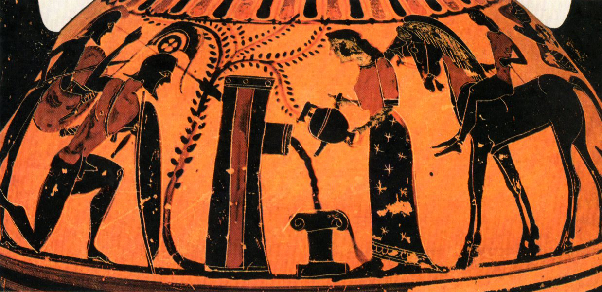 Λεγόταν ότι συναντήθηκαν στην πηγή, όπου ο αδελφός της Τρωίλος πήγε να ποτίσει τα άλογά του και η κόρη να πάρει νερό. Εκεί ο Αχιλλέας καταδίωξε και σκότωσε τον νέο και ερωτεύτηκε το κορίτσι, το οποίο όμως κατάφερε να ξεφύγει. Η εκδοχή αυτή δομήθηκε πάνω στο γνωστό μοτίβο αρπαγών των κοριτσιών από νέους σε περιβάλλοντα όμορφα, θαλερά και αναγκαία για την επιβίωση, σε περιβάλλοντα εκτός πόλεως, επομένως επικίνδυνα για τις κοπέλες, καθώς, απροστάτευτες μέσα στο φυσικό τοπίο, ήταν εκτεθειμένες στις ορέξεις μεγάλων γητευτών. (Εικ. 282, 283, 284, 285, 286, 291, 293, 294, 299, 300, 301, 302, 305, 306, 307, 318, 353)
