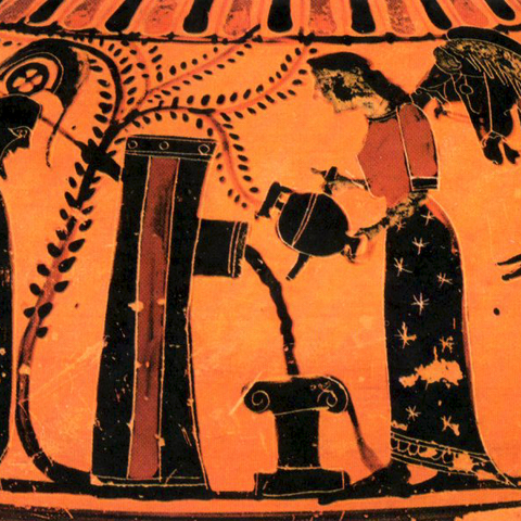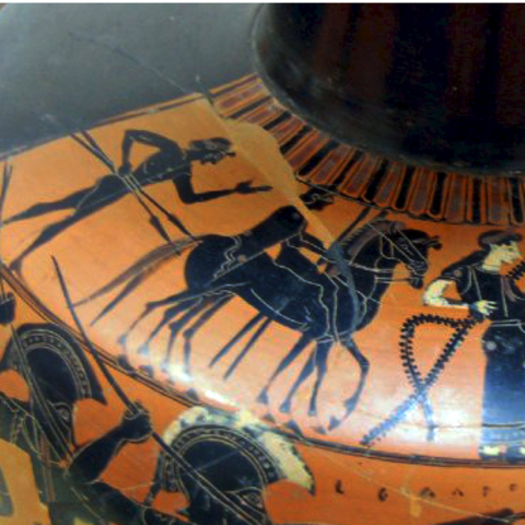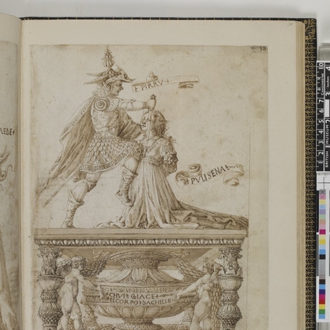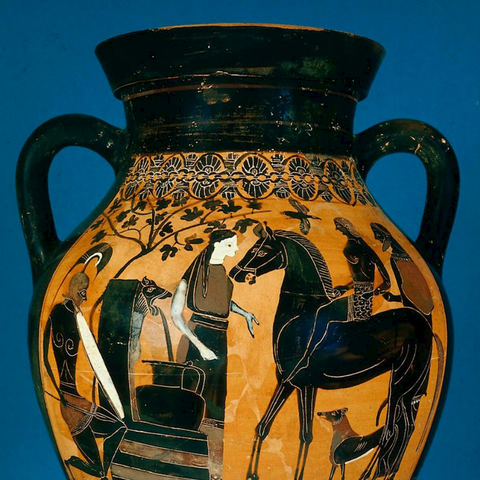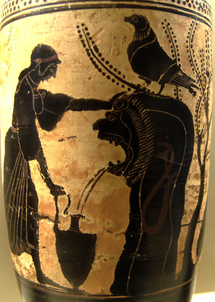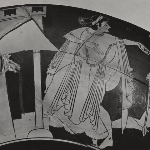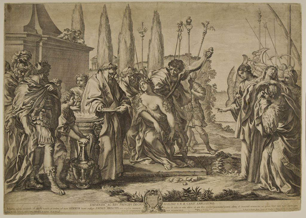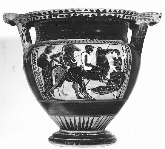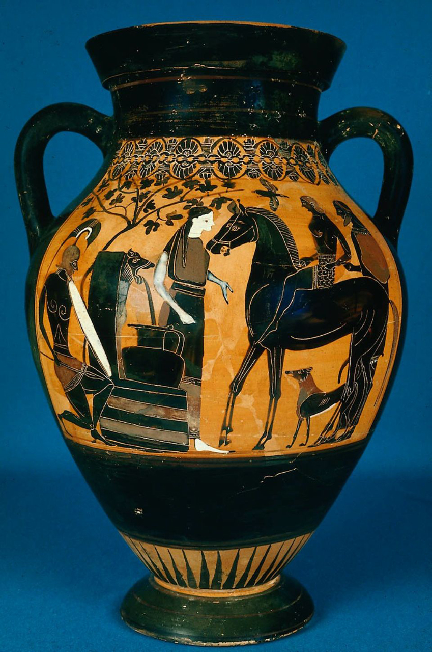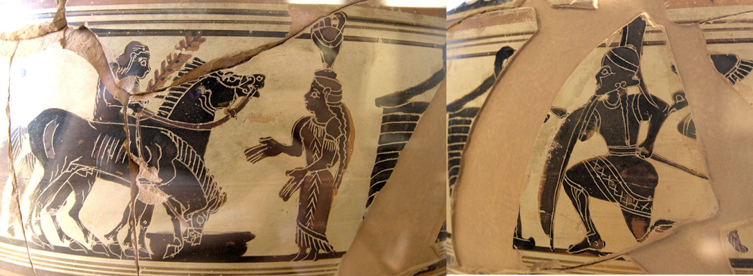 Λεγόταν ότι συναντήθηκαν στην πηγή, όπου ο αδελφός της Τρωίλος πήγε να ποτίσει τα άλογά του και η κόρη να πάρει νερό. Εκεί ο Αχιλλέας καταδίωξε και σκότωσε τον νέο και ερωτεύτηκε το κορίτσι, το οποίο όμως κατάφερε να ξεφύγει. Η εκδοχή αυτή δομήθηκε πάνω στο γνωστό μοτίβο αρπαγών των κοριτσιών από νέους σε περιβάλλοντα όμορφα, θαλερά και αναγκαία για την επιβίωση, σε περιβάλλοντα εκτός πόλεως, επομένως επικίνδυνα για τις κοπέλες, καθώς, απροστάτευτες μέσα στο φυσικό τοπίο, ήταν εκτεθειμένες στις ορέξεις μεγάλων γητευτών. (Εικ. 282, 283, 284, 285, 286, 291, 293, 294, 299, 300, 301, 302, 305, 306, 307, 318, 353)