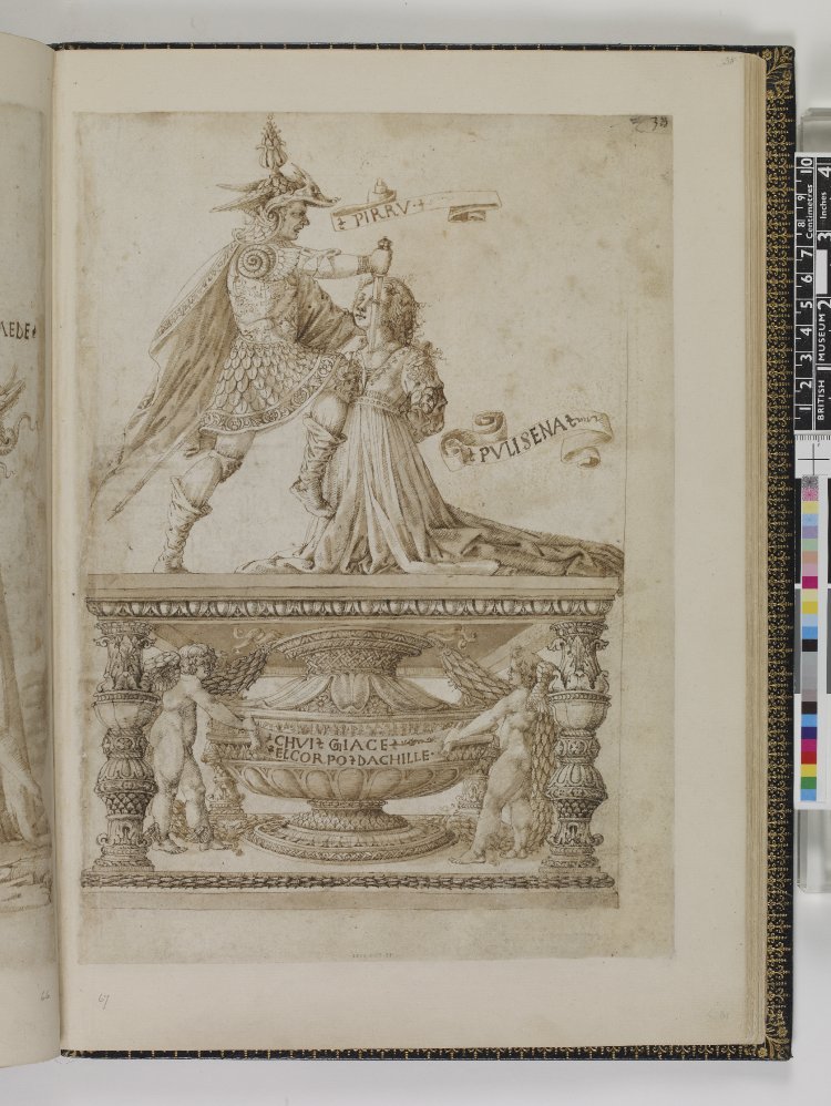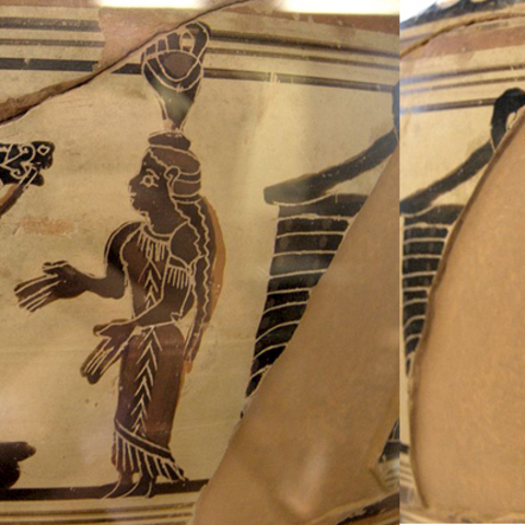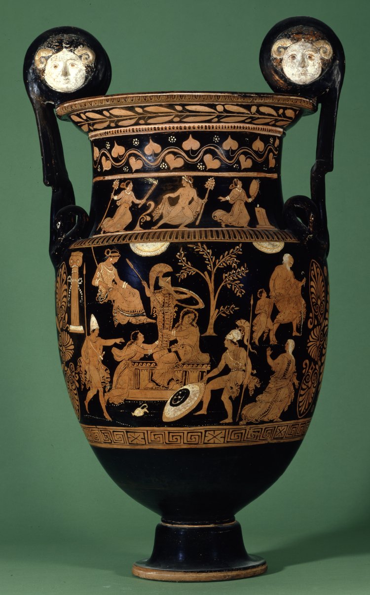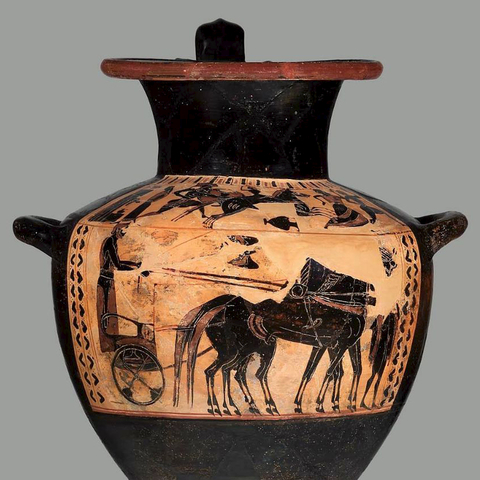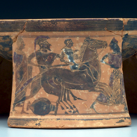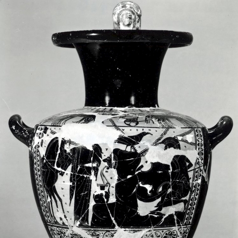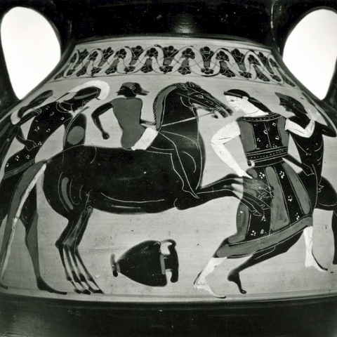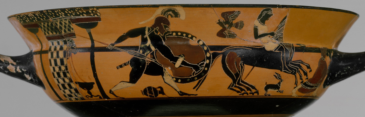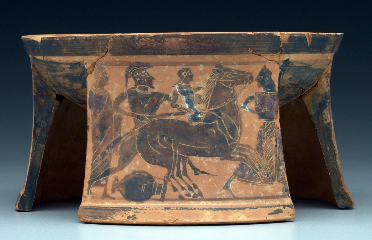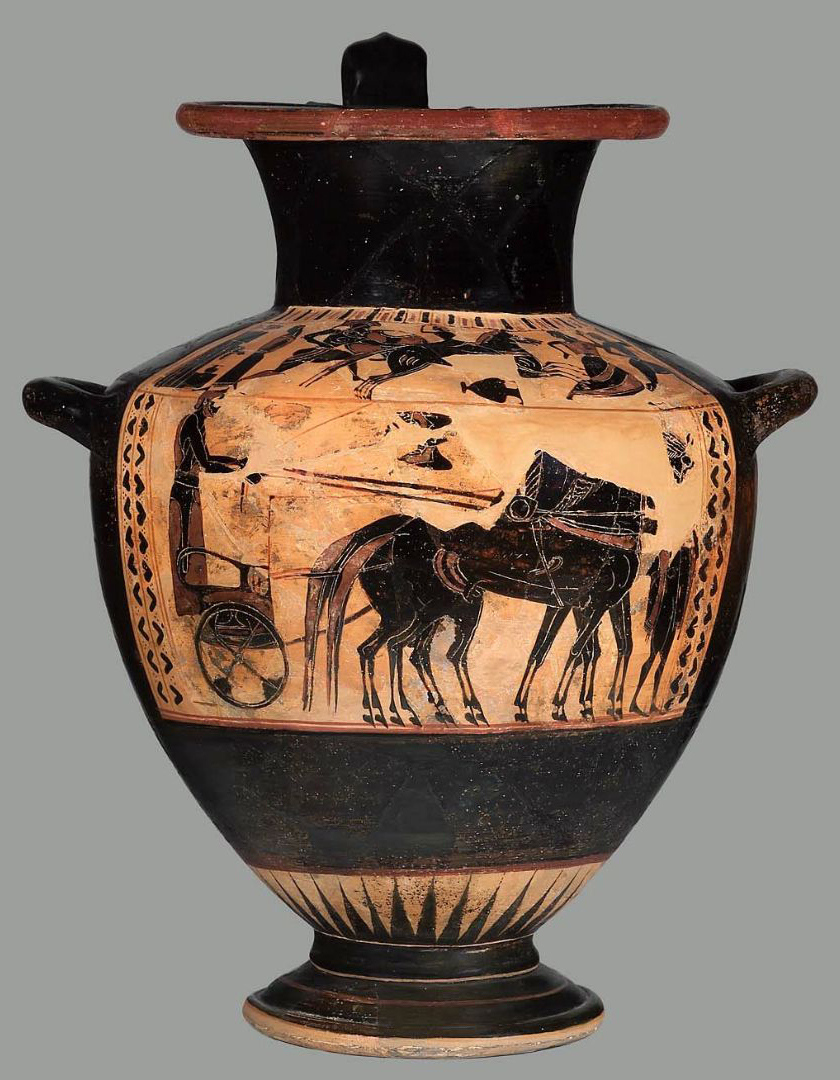 Λεγόταν ότι συναντήθηκαν στην πηγή, όπου ο αδελφός της Τρωίλος πήγε να ποτίσει τα άλογά του και η κόρη να πάρει νερό. Εκεί ο Αχιλλέας καταδίωξε και σκότωσε τον νέο και ερωτεύτηκε το κορίτσι, το οποίο όμως κατάφερε να ξεφύγει. Η εκδοχή αυτή δομήθηκε πάνω στο γνωστό μοτίβο αρπαγών των κοριτσιών από νέους σε περιβάλλοντα όμορφα, θαλερά και αναγκαία για την επιβίωση, σε περιβάλλοντα εκτός πόλεως, επομένως επικίνδυνα για τις κοπέλες, καθώς, απροστάτευτες μέσα στο φυσικό τοπίο, ήταν εκτεθειμένες στις ορέξεις μεγάλων γητευτών. (Εικ. 282, 283, 284, 285, 286, 291, 293, 294, 299, 300, 301, 302, 305, 306, 307, 318, 353)