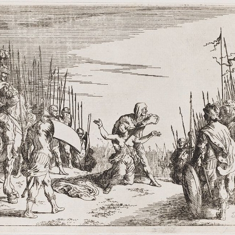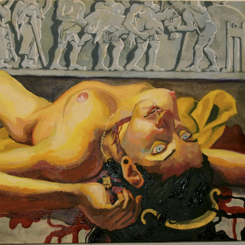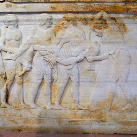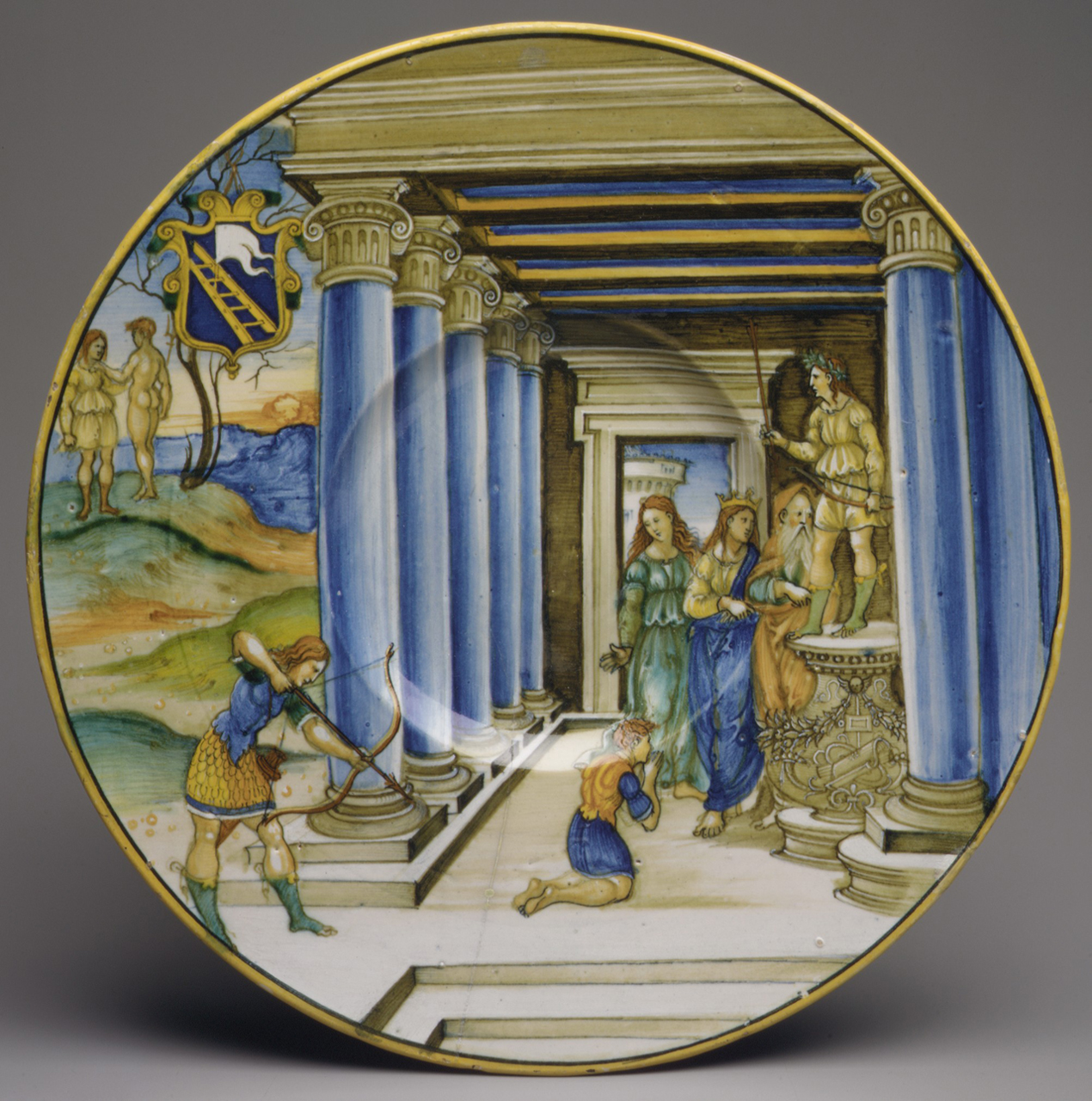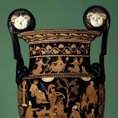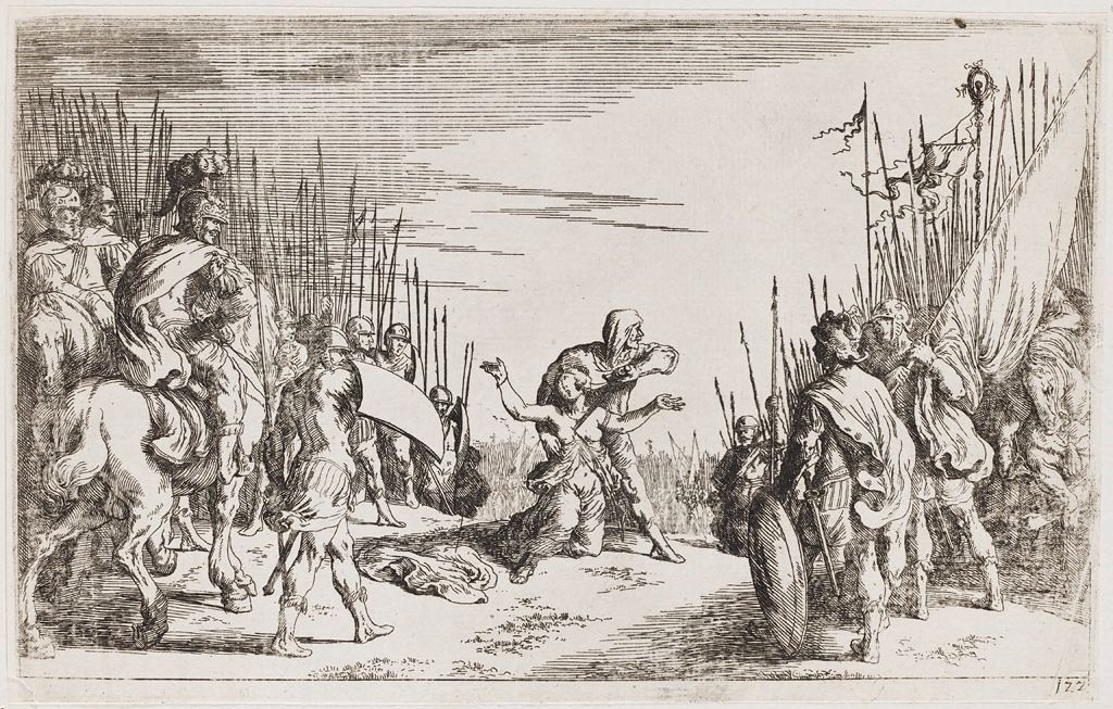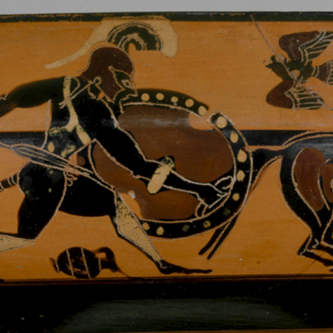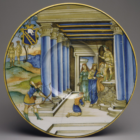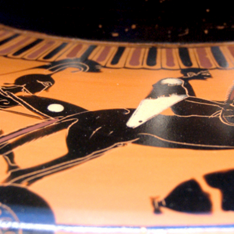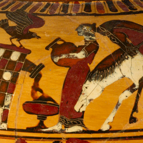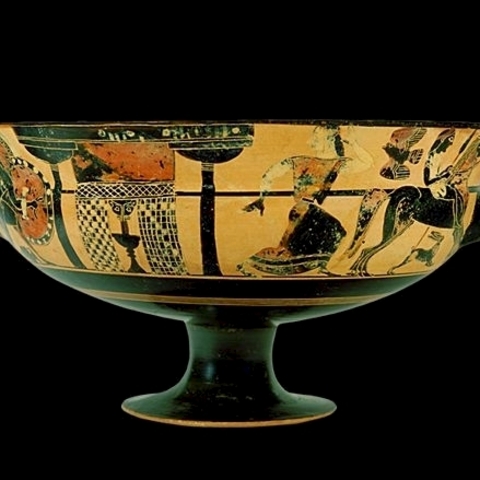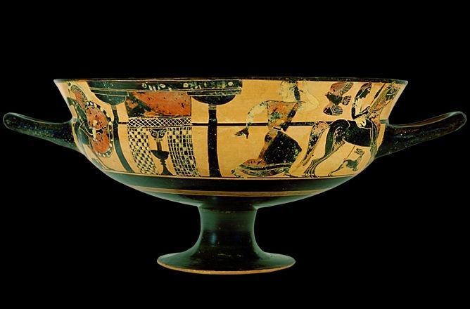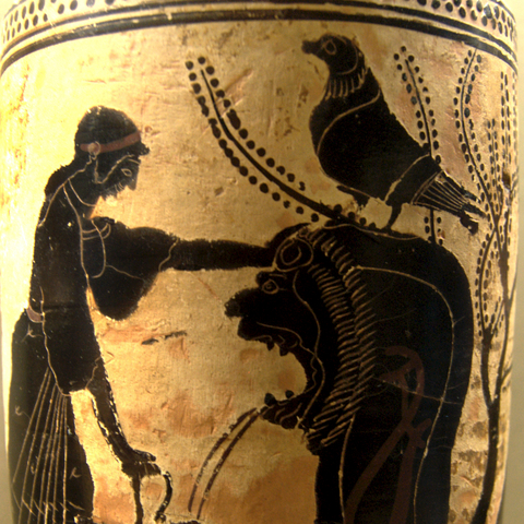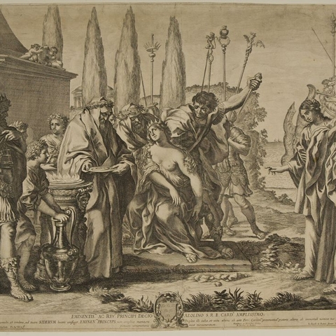 Λεγόταν ότι συναντήθηκαν στην πηγή, όπου ο αδελφός της Τρωίλος πήγε να ποτίσει τα άλογά του και η κόρη να πάρει νερό. Εκεί ο Αχιλλέας καταδίωξε και σκότωσε τον νέο και ερωτεύτηκε το κορίτσι, το οποίο όμως κατάφερε να ξεφύγει. Η εκδοχή αυτή δομήθηκε πάνω στο γνωστό μοτίβο αρπαγών των κοριτσιών από νέους σε περιβάλλοντα όμορφα, θαλερά και αναγκαία για την επιβίωση, σε περιβάλλοντα εκτός πόλεως, επομένως επικίνδυνα για τις κοπέλες, καθώς, απροστάτευτες μέσα στο φυσικό τοπίο, ήταν εκτεθειμένες στις ορέξεις μεγάλων γητευτών. (Εικ. 282, 283, 284, 285, 286, 291, 293, 294, 299, 300, 301, 302, 305, 306, 307, 318, 353)