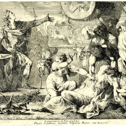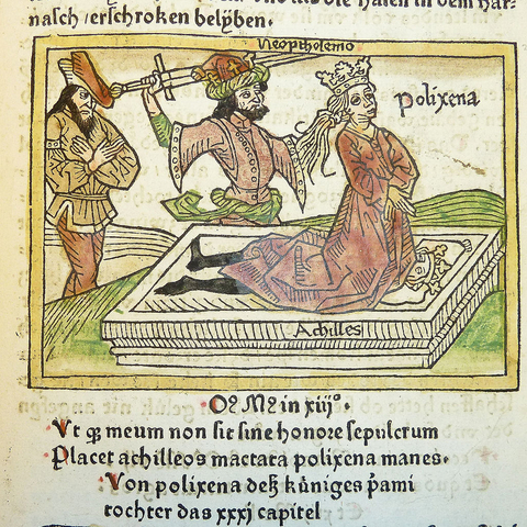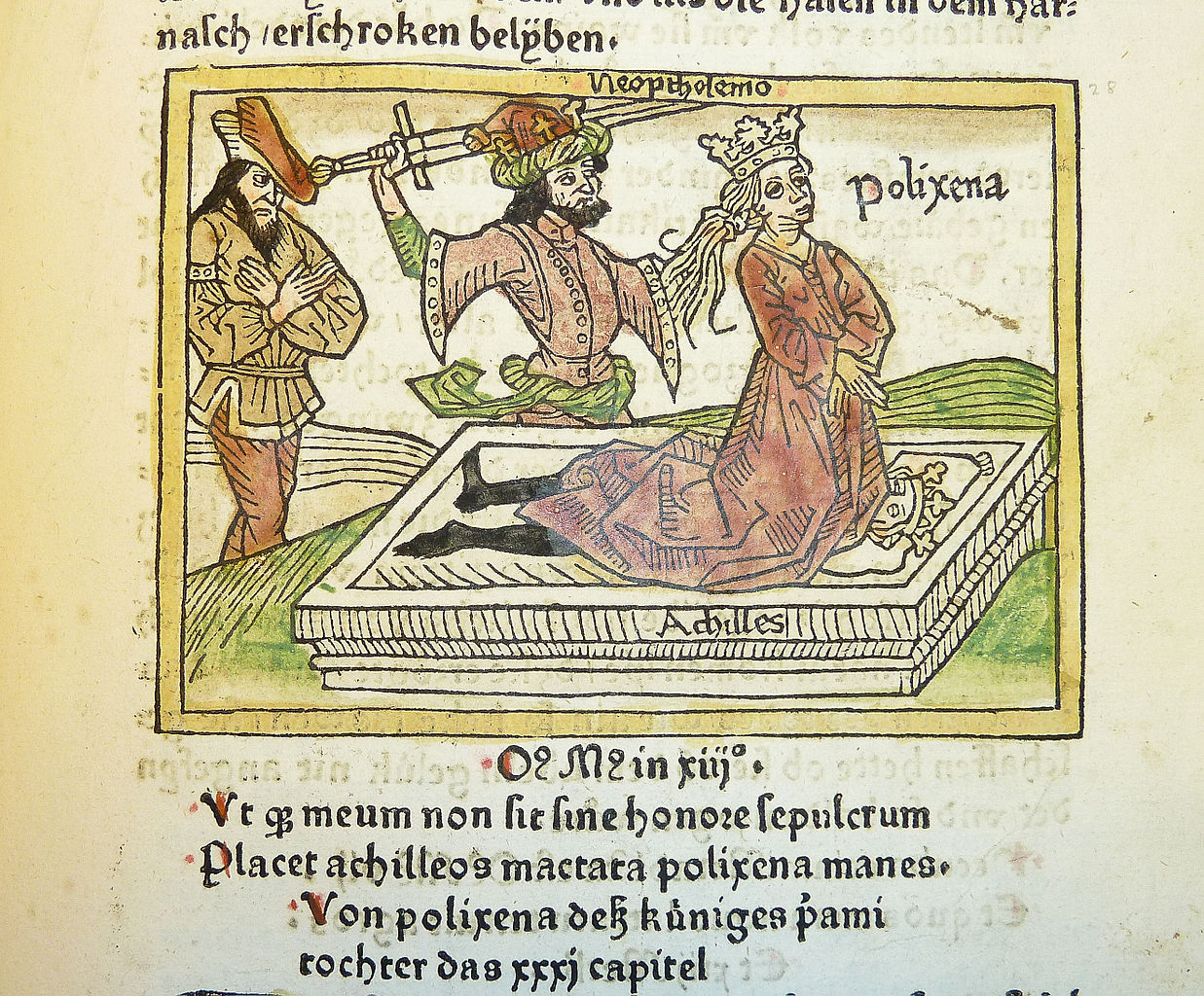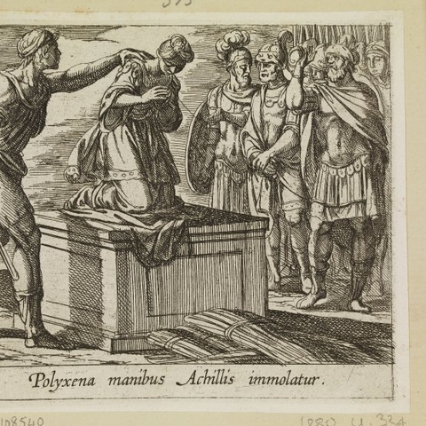 Πιο παλιοί είναι οι σχετικοί με τον θάνατό της μύθοι. Στα Κύπρια έπη παραδίδεται ότι η Πολυξένη τραυματίστηκε από τον Διομήδη και τον Οδυσσέα κατά την άλωση της Τροίας, υπέκυψε στα τραύματά της και την έθαψε ο Νεοπτόλεμος. Αργότερα πλάστηκε η ιστορία ότι θυσιάστηκε πάνω στον τάφο του Αχιλλέα από τον Νεοπτόλεμο ή από άλλους αρχηγούς, τον Δημοφώντα και τον Ακάμαντα, γιους του Θησέα (Ιλίου Πέρσις) με την παρακίνηση του Οδυσσέα. Οι Αχαιοί τη θυσίασαν για να καταστεί ευκολότερο το ταξίδι της επιστροφής των Αχαιών, όπως ακριβώς η θυσία της Ιφιγένειας είχε εξασφαλίσει τους ευνοϊκούς ανέμους για το ταξίδι της αναχώρησης από την Ελλάδα προς την Τροία. Ή επειδή το είχε ζητήσει το φάντασμα του Αχιλλέα που είχε εμφανιστεί σε όνειρο στον γιο του και του ζητούσε την προσφορά της κόρης σαν μερίδιο από τα λάφυρα του πολέμου που δικαιούνταν. (Εικ. 330, 335, 354, 355, 356, 357, 358, 359, 360, 361, 362) Στην τραγωδία Εκάβη, ο Ευριπίδης βάζει την Πολυξένη να προχωρά στον τόπο της θυσίας αυτοβούλως, όπου αντιμετώπισε περήφανα τον Οδυσσέα (Ευρ., Εκάβη 342-378). (Εικ. 363) Το τελετουργικό της θυσίας δίνεται από τον ποιητή με τρόπο ανάλογο με εκείνο της θυσίας της Ιφιγένειας στην τραγωδία Ιφιγένεια εν Αυλίδι. Οι αγγελικές ρήσεις στις δύο τραγωδίες παρουσιάζουν δομικές αντιστοιχίες. (Εικ. 364)