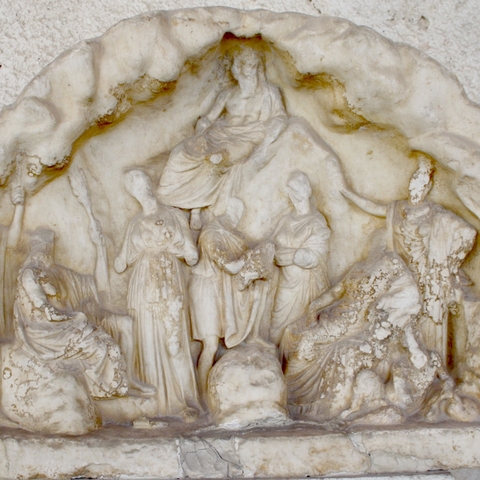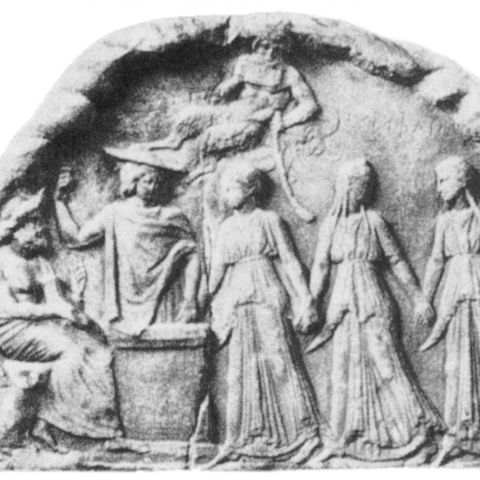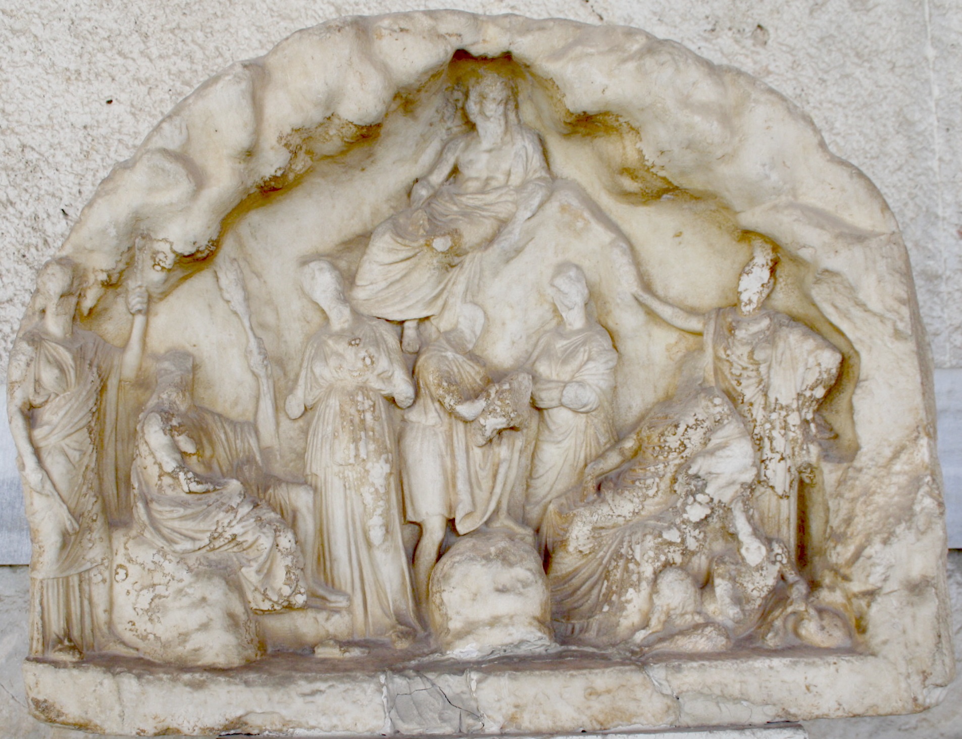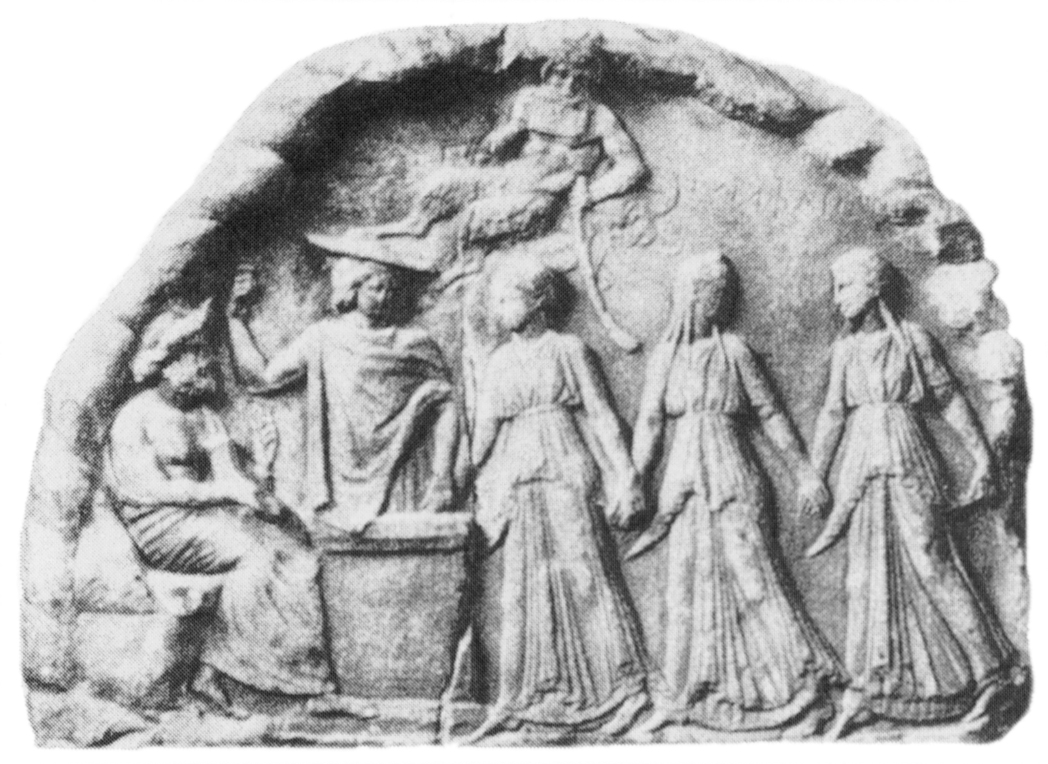 Πάλι σε αναθηματικό ανάγλυφο, των αρχών του 1ου αι. π.Χ., οι Νύμφες εμφανίζονται με τον Ερμή, τον Αχελώο και τον Πάνα (Εικ. 34, 35, 36). Ο Πάνας και ο Ερμής συνοδεύουν τις Νύμφες και υποδηλώνουν τη ζωή τους στο ύπαιθρο. Ο Ερμής όμως είναι και ψυχοπομπός. Επιπλέον, ο βωμός μπροστά στον προσωποποιημένο Αχελώο δηλώνει τράπεζα προσφορών και το όλο ανάγλυφο θυμίζει είσοδο σπηλιάς. Το σκηνικό στο σύνολο του μας επιτρέπει να εικάσουμε ότι έχουμε καλλιτεχνική απόδοση ενός συγκεκριμένου μύθου. Όταν τέσσερις Νύμφες θυσίαζαν στις όχθες του Αχελώου, λησμόνησαν να επικαλεστούν τον θεό-ποταμό. Οργισμένος ο θεός ανέβασε τα νερά του και τις παρέσυρε στη θάλασσα, όπου έγιναν νησιά -οι Εχινάδες Νήσοι. Επειδή όμως τα νησιά είναι πέντε, ο μύθος συμπληρώνει ότι το πέμπτο νησί ήταν μια κοπέλα, η Περιμήλη, την οποία διέφθειρε ο Αχελώος. Όταν ο πατέρος της Ιπποδάμας, θυμωμένος, την έριξε στον ποταμό τη στιγμή που επρόκειτο να φέρει στον κόσμο ένα παιδί, ο Αχελώος ικέτεψε τον Ποσειδώνα να σώσει τη νέα γυναίκα, και εκείνος τη μεταμόρφωσε σε νησί. Από άποψη εικαστική το ανάγλυφο είναι αρχαϊστικό στην απεικόνιση των Νυμφών, ενώ κατά τ' άλλα ακολουθεί το τυπικό των αναγλύφων του 4ου αι. Ο αρχαϊσμός αυτός μπορεί να είναι διακοσμητικός, γραφικός, γοητευτικός, νοσταλγικός, ή να εκφράζει ένα θρησκευτικό συντηρητισμό και μια τάση για ανάκληση αρχαίων, σεβαστών τύπων.