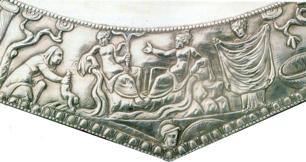Σε αργυρό πινάκιο γύρω στα 350 μ.Χ., όταν ήδη η νέα θρησκεία του χριστιανισμού κάνει πια δυναμικά εμφανή την παρουσία της, ο καλλιτέχνης προσωποποιεί τις ποτάμιες θεότητες Στύγα και Αχέροντα σε μια παράσταση εμβαπτίσματος του Αχιλλέα για πρώτη φορά μετά τη γέννησή του (Εικ. 51). Μοιάζει η παλιά θρησκεία να αντιτάσσει το δικό της θεόπαιδο στο θεϊκό παιδί της καινούριας θρησκείας, ενώ οι προσωποποιήσεις των συγκεκριμένων υδάτων δεν νομίζουμε ότι είναι τυχαία.[14] Δεν είναι μόνο ότι αποτυπώνεται η μυθική πραγματικότητα -σε ποια νερά έγινε η εμβάπτιση και σε ποιο μέρος βασίλεψε ο Αχιλλέας (η Ήπειρος υποδηλώνεται με τον Αχέροντα)- αλλά ότι εμβαπτίζεται σε ό,τι θεωρούνταν στην παλιά θρησκεία ως το πιο παλιό (Στύγα), άρα και πιο ιερό, για να γίνει αθάνατος. Πρόκειται άραγε για προσπάθεια να δειχθεί ότι και η παλιά θρησκεία θα παραμείνει αιώνια; (Εικ. 52)