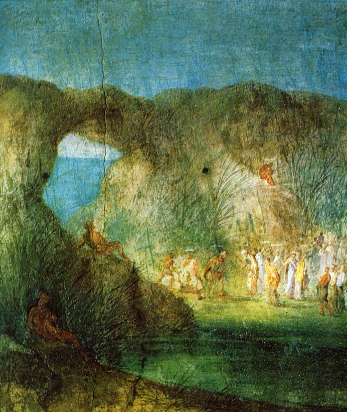 «[…] ζωγράφισαν τη σκηνή ενός νέου που βουτάει, υπερπηδώντας μια κατασκευή, σε μικρό κύκλο νερού, τον οποίο περιβάλλουν δύο δενδρύλλια. Είναι προφανής η νεκρική υποδήλωση […]. Το μνημείο που απεικονίζεται ερμηνεύεται ως η πύλη του Άδη και ταυτόχρονα ως όριο του γνωστού κόσμου, οπότε η βουτιά συμβολίζει το πέρασμα στον άλλον κόσμο, κατ' εξοχήν άγνωστο, ο οποίος βρίσκεται πέρα από τα όρια της γνώσης».[13]