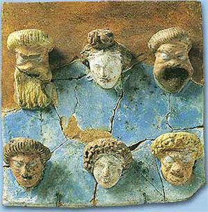 Πήλινο πλακίδιο από ελληνιστικό τάφο στην Αμφίπολη. Στην κυανόχρωμη επιφάνειά του είναι επικολλημένα προσωπεία ηθοποιών που παριστάνουν τύπους της Νέας Κωμωδίας. 3ος αιώνας π.Χ.