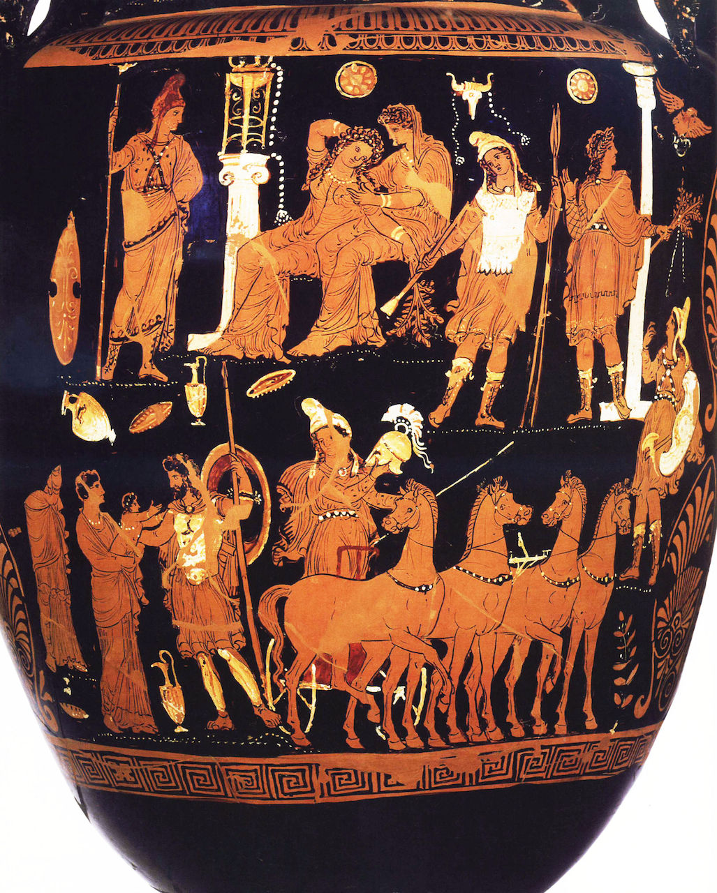 Απουλικός ελικοειδής κρατήρας, περ. 320 π.Χ. Στη μία πλευρά απεικονίζονται η έξοδος του Έκτορα με το άρμα του και ο θρήνος της Κασσάνδρας. Η αγγειογραφία θεωρείται σχετική με μια τραγωδία για τον Έκτορα, πολύ πιθανώς τον Έκτορα του Αστυδάμαντα. Αποδίδεται στον Ζωγράφο του Κάτω Κόσμου (The Underworld Painter). Η αγγειογραφία αυτή, με την πρώτη ματιά, φαίνεται ότι διαδραματίζεται στην Ανατολή, καθώς τέσσερις μορφές φορούν φρυγικούς πίλους. Στην κάτω ζώνη γίνεται σαφές ότι πρόκειται για τη σκηνή, όπου ο Έκτορας αποχαιρετά την Ανδρομάχη και τον Αστυάνακτα. Ωστόσο, μικρές λεπτομέρειες υποδεικνύουν ότι η αφήγηση που αντικατοπτρίζεται δεν είναι αυτή της Ιλιάδας. Το κράνος του Έκτορα το κρατάει ο οδηγός του άρματός του, εμφανές και γυαλισμένο στο κέντρο της σκηνής. Στην επάνω ζώνη έχουμε πάλι θνητούς: η Κασσάνδρα σε προφητική έκσταση, ίσως στην αγκαλιά της Εκάβης. Ο άντρας στα αριστερά ίσως είναι ο Πρίαμος, ενώ στα δεξιά ο Έλενος ερμηνεύει τον οιωνό του πτηνού που πετάει κρατώντας ένα φίδι στα νύχια του. Υπάρχει μια τραγωδία με τον τίτλο Έκτωρ του Αστυδάμαντα, και φαίνεται ότι τουλάχιστον τα τρία από τα τέσσερα αποσπάσματα του έργου που σώζονται αντικατοπτρίζονται σε αυτό το αγγείο.