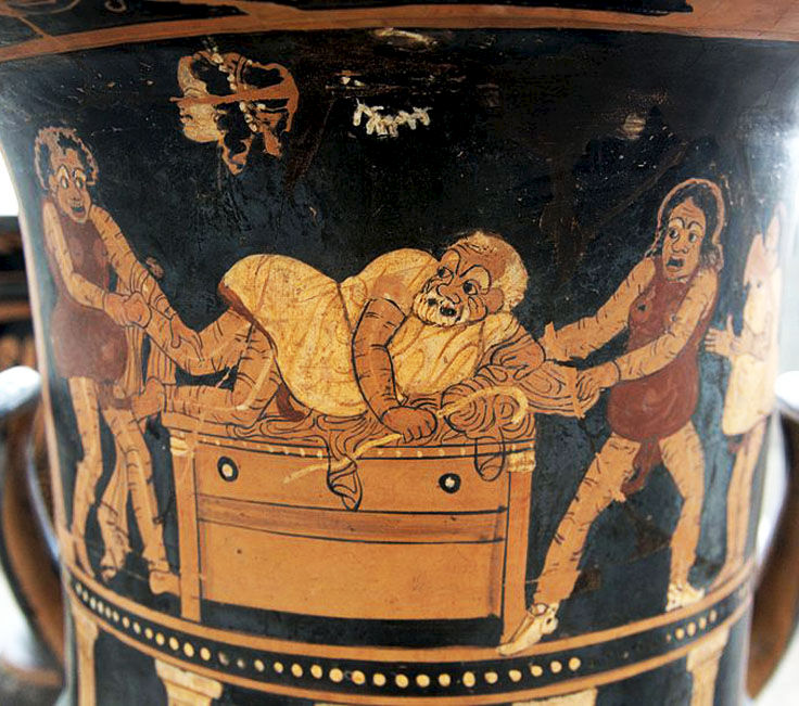 Ερυθρόμορφος κρατήρας από το Paestum, Sant'Agata dei Goti, 350-340 π.Χ. Απεικονίζει χαρακτηριστική σκηνή ιλαροτραγωδίας: τρεις άντρες (ο Γυμνίλος, ο Κόσιος και ο Καρίων) κλέβουν τον τσιγκούνη Χαρίνο μέσα στο σπίτι του.