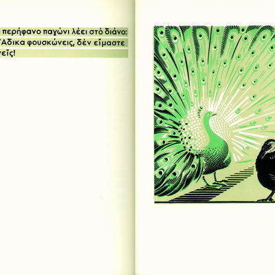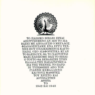 Τυπώνεται στην Αθήνα το Παγώνι, το παιδικό βιβλίο που γράφει ο Ζαχαρίας Παπαντωνίου και φιλοτεχνεί με τις ξυλογραφίες του ο Γιάννης Κεφαλληνός. Πρόθεσή τους είναι να φτιάξουν ένα παιδικό βιβλίο που να απευθύνεται σε παιδιά αλλά να το απολαμβάνουν εξίσου και οι μεγάλοι. Η εκτύπωση του βιβλίου κράτησε ενάμιση χρόνο, δείγμα της τελειότητας που επιδίωκαν οι δημιουργοί του αλλά και των δυχερειών της Κατοχής, μέσα σε τρομαχτικές στερήσεις και κάτω από το φάσμα του θανάτου που ενέδρευε κάθε στιγμή παντού.