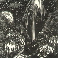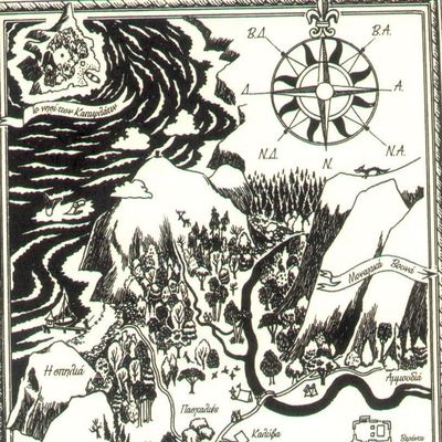 Στην κατηφοριά, λίγο πιο δεξιά από το δέντρο όπου είχε κρεμασμένη την αιώρα του ο Μπαμπάς Μούμιν, υπήρχε μια λιμνούλα. Τα νερά της ήταν καθαρά αλλά μαύρα. Η Κόρη της Μύμλιν επέμενε, βέβαια, πως τα νερά δεν ήταν μαύρα• έμοιαζαν μαύρα, έλεγε, επειδή ήταν πολύ βαθιά. Έλεγε πως η λίμνη στη μέση της δεν είχε πάτο. Μπορεί και να ‘χε δίκιο. Στις όχθες τριγύρω φύτρωναν νούφαρα με πλατιά μεγάλα φύλλα, όπου κάθονταν και ξεκουράζονταν σκαθάρια και λιβελούλες. Κάτω από την επιφάνεια οι αραχνούλες του νερού κολυμπούσαν αργά, με ύφος σπουδαίο. Πιο κάτω γυάλιζαν σαν χρυσά τα μάτια της Βατραχίνας. Αν ήσουν τυχερός, μπορεί και να ‘βλεπες με την άκρη του ματιού σου και τους μυστηριώδεις συγγενείς της, που κατοικούσαν βαθιά στις λάσπες.