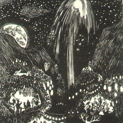 Ύστερα πλάγιασαν όλοι στα κρεβάτια τους και βολεύτηκαν και χουχουλιάστηκαν, σκεπάστηκαν ως τ’ αυτιά κι άρχισαν να σκέφτονται κάτι όμορφο. Ο Μούμιν, όμως, αναστέναξε και είπε: