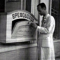 Η δεκαετία του 1950 ήταν μία δύσκολη περίοδος για την Ελλάδα. Πολλές γυναίκες αναγκάζονταν να εγκαταλείπουν τα νεογέννητα παιδιά τους, είτε γιατί είχαν γεννηθεί εκτός γάμου, είτε γιατί δεν μπορούσαν να τα ζήσουν. Την περίοδο εκείνη, στο Δημοτικό Βρεφοκομείο Αθηνών, στην οδό Πειραιώς, βρίσκονταν 230 εγκαταλελειμμένα παιδιά. Η βρεφοδόχος ήταν ένα κιβώτιο που χωρούσε μέχρι και δύο βρέφη, ξαπλωμένα. Βρισκόταν στον εξωτερικό τοίχο βρεφοκομείων, για να μπορούν να αφήνουν κρυφά τα «απορριπτόμενα» μωρά. Όταν τοποθετούσαν το μωρό στο κιβώτιο, ένα ηλεκτρικό κουδούνι ανήγγελλε στο προσωπικό του βρεφοκομείου την «πράξιν της εγκαταλείψεως». Παραπάνω απ’ τα μισά θα πέθαιναν μέσα σε λίγους μήνες, λόγω έλλειψης τροφίμων και φαρμάκων….