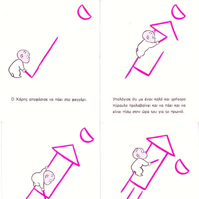 Με ελάχιστες γραμμές ο Τζόνσον απεικόνισε τον Χάρη, ένα παιδάκι με τις πυτζάμες του που με το στρουμπουλό χεράκι του κρατάει ένα μοβ μαρκαδόρο. Από σελίδα σε σελίδα η παχιά μοβ γραμμή που χαράζει περιγράφει τις πράξεις του Χάρη πάνω στο λευκό φόντο τόσο αποτελεσματικά και ευρηματικά που ο μαρκαδόρος γίνεται τόσο πρωταγωνιστής όσο και ο Χάρης.