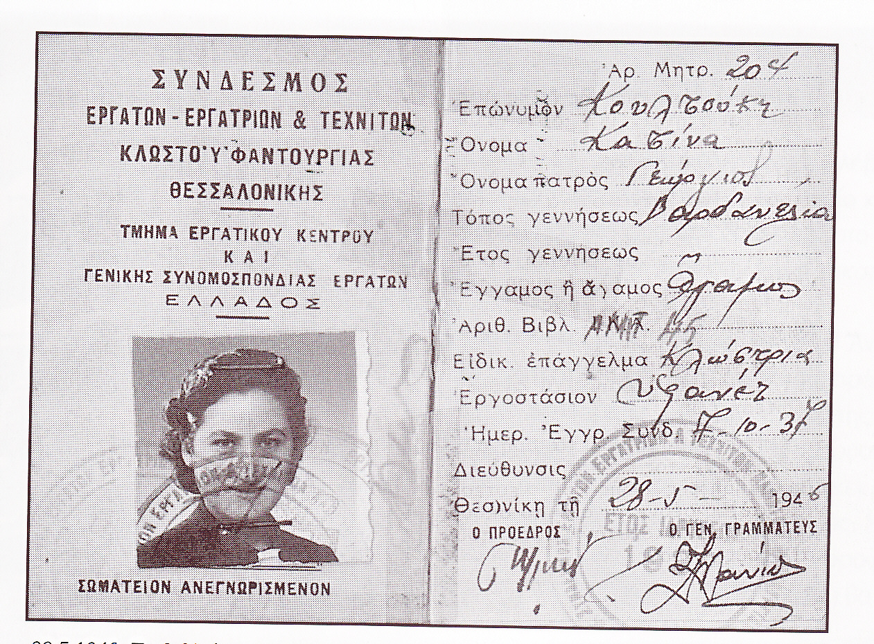 […] ύστερα, θα σου πω πού πήγα: στο εργοστάσιο του Φλόκα, που κάνανε σοκολατάκια, τυλίγαμε σοκολατάκια […] ποιος με βοηθούσε να βρω δουλειά; Ε, μόνη μου έτρεχα απ’ τη μια και απ’ την άλλη. Έλεγα “άμα θέλετε καμιά να με παίρνετε”, ε, και πήγαινα, αλλά χωρίς έτσι, όπως βάζουνε τα σήματα (Σημ. εννοεί : ένσημα, ασφάλιση), τέτοια δεν είχε. Και μας έλεγε το αφεντικό, άμα θα ’ρθουν από την εφορία να πάμε στην τουαλέτα (Σημ. : για να κρυφτούνε). Πηγαίναμε, εκεί καθόμασταν, ώσπου να φύγουνε.
