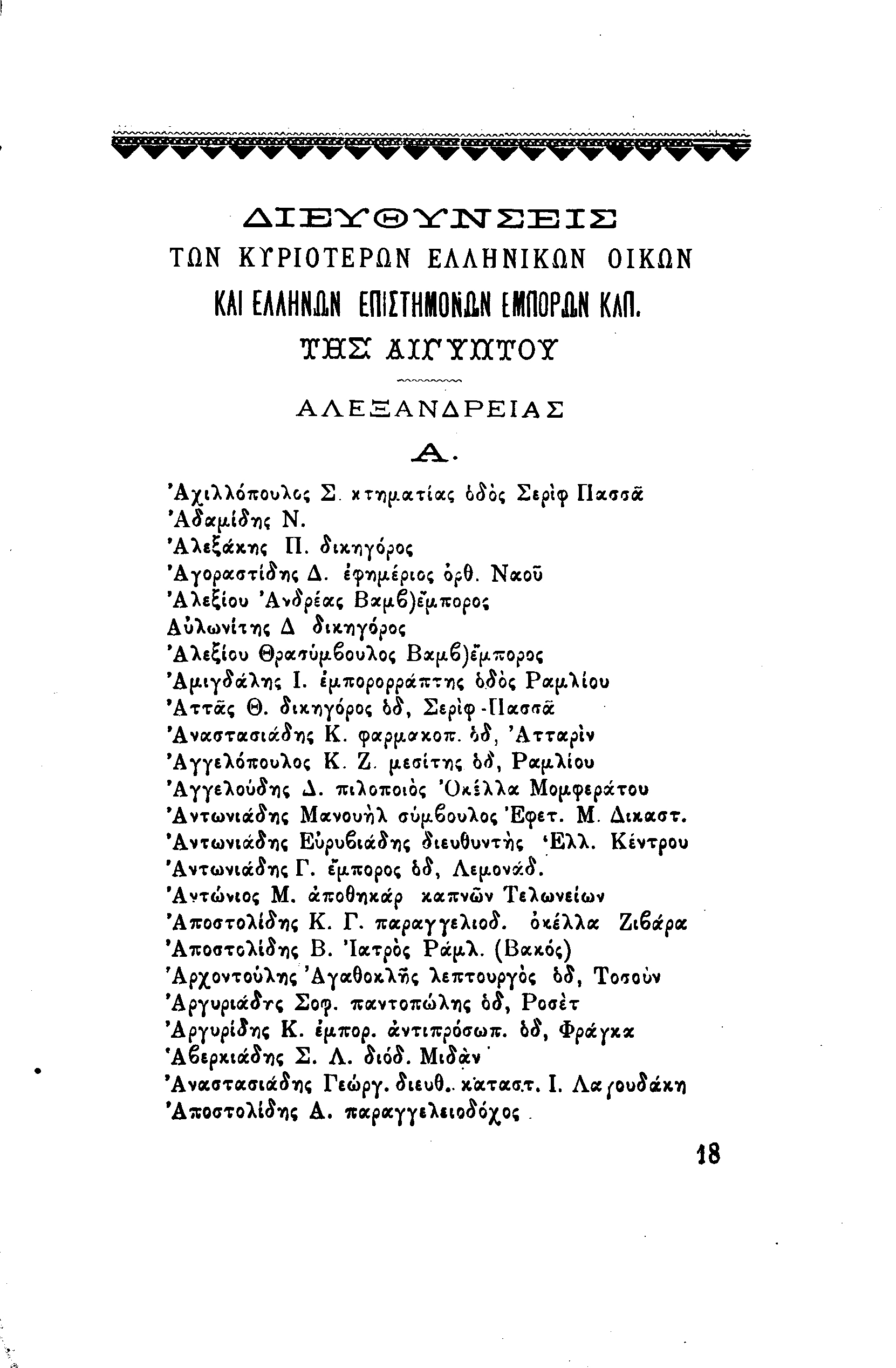 Οι κυράδες βλέπουνε μέσα στα πιατάκια με τους μεζέδες· οι κύριοι διαβάζουν και ξαναδιαβάζουνε τις ταμπέλες των μαγαζιών, απέναντι. Οχ, δεν είναι Ιμπραημία τούτη, είναι κυριακάτικη έξοδο «ομογενών» στο Ασσιούτ, πεντακόσια μίλια βαθιά, μέσα στην κουτσομπόλα, την κιτρινιάρικη επαρχία. Που ’ναι τα χρόνια που έβραζε η Ιμπραημία και το Καμποτσέζαρε — η Κοκκινιά κι η Δραπετσώνα — στη μπαλαμάνα και στο ρε;