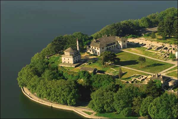 Το νησί απέναντι από την πόλη είναι γραφικό στη γενική του εμφάνιση και εξωραΐζεται με ένα μικρό παλάτι του Βεζύρη που φαίνεται στην ακτή του. Ένα χωριό στη βόρεια πλευρά του είναι σχεδόν κρυμμένο από τα πλούσια φυλλώματα των καστανιών και των πλατάνων, που μεγαλώνουν ανάμεσα στα σπίτια του. Ο ταξιδιώτης καλό θα είναι να σκαρφαλώσει στο ψηλότερο σημείο του νησιού, απ’ όπου θ’ απολαύσει μία πολύ επιβλητική θεά της πόλης και των οικοδομών στους βράχους του φρουρίου.