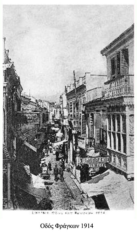 Ο κοσμοπολιτισμός της Σμύρνης έβρισκε την ανώτατη εκδήλωσή του στον πλούτο των εισαγόμενων και εξαγόμενων εμπορευμάτων, με αποτέλεσμα την ποικιλία επιλογών που απολάμβαναν οι Σμυρνιοί, καμαρώνοντας για την αγορά τους. Ο Φραγκομαχαλάς (Ευρωπαϊκή οδός, ή και Rue Franque, οδός δηλαδή των Φράγκων), συγκεντρώνει τα καλύτερα μαγαζιά της πόλης, με λογής προϊόντα που καταφθάνουν από την Ευρώπη. Είναι ο τόπος που οι ευκατάστατοι Σμυρνιοί όλων των εθνοτήτων αγοράζουν ό,τι καλύτερο και νεώτερο κυκλοφορεί.