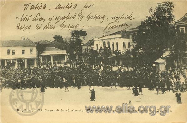 Εκείνος του απάντησε μ’ ένα γνέψιμο με τα μάτια. Διακόσια μέτρα μακριά, στο σημείο όπου η πλατεία ανοίγει προς την προκυμαία, το λάβαρο ενός άγιου εκεί που έστριβε τη γωνιά κουνιότανε ζωηρά όπως το πανί μιας βάρκας στη θύελλα. Ένα μουρμουρητό διαπέρασε τα πλήθη. Υπάλληλοι και γραφιάδες, με βλαστούς βασιλικό στην κορδέλα στα ψαθάκια τους, ναυτικοί με ανοιχτά πουκάμισα κι έφηβοι που κουνούσαν ζωγραφισμένα λάβαρα, σα να ήταν εξαπτέρυγα σε παρέλαση. Άρχισαν όλοι να σπρώχνονται με τους αγκώνες, προσπαθώντας ο καθένας να περάσει στην πρώτη γραμμή, ώστε να βλέπει καλύτερα, τεντώνοντας το λαιμό τους στην επιθυμία τους να δουν τους στρατιώτες.