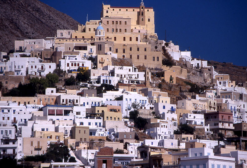 Η Σύρος, από τη θάλασσα, είναι σα μια εξαίσια ακουαρέλα. Δυο ψηλοί κωνικοί λόφοι, σκεπασμένοι από τη ρίζα τους ως την κορφή τους με άσπρα, ρόδινα και γαλάζια σπίτια, καθρεφτίζονται πάνω στα γαλήνια νερά.