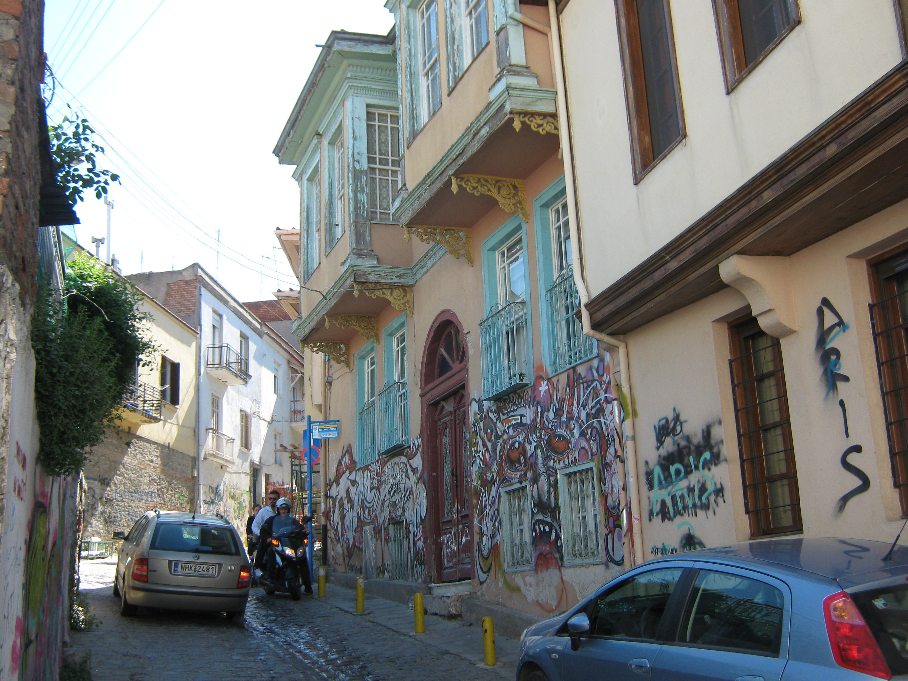 Ωστόσο, αν η οδός Ολυμπιάδος (που χωρίζει σαν ζωνάρι τη σημερινή άνω πόλη από την κάτω) είναι ο σπουδαιότερος οριζόντιος δρόμος, η οδός Δημητρίου Πολιορκητού (που ενώνει την άνω πόλη με την κάτω) είναι ο σπουδαιότερος κάθετος δρόμος. Κάθετος, τρόπος του λέγειν, γιατί στριφογυρίζει γοητευτικά σα φίδι ή σαν ποταμάκι. Αρχίζει πίσω από το διοικητήριο και τελειώνει στη μονή Βλατάδων. Για να τον περπατήσεις, δε φτάνει μισή ώρα, αλλά σίγουρα ο περίπατος αποζημιώνει με το παραπάνω, καθώς τα πολλά γραφικά στενοσόκακα δίνουν μια αυθεντική εικόνα τού πώς ήταν η βυζαντινή και η τουρκοκρατούμενη Θεσσαλονίκη. Βλέποντας τα στριφογυριστά καλντερίμια της άνω πόλης, που διαδέχτηκαν το αρχαίο ορθολογιστικό ιπποδάμειο σύστημα, με τα αυστηρά οικοδομικά τετράγωνα, σκέφτηκα πως, τουλάχιστον σ’ αυτές τις συνοικίες, η ανατολή κατάφερε να ξαναγυρίσει, έστω και σαν στραπατσαρισμένη γραφικότητα, και να επιβιώσει σχεδόν μέχρι σήμερα. Σώζονται λοιπόν αρκετά παλιά σπίτια — τα πιο πολλά, διατηρητέα —, πού και πού κανένα παλιό αρχοντικό, που και μες στην εγκατάλειψή του επιμένει να λάμπει, πολλά προσφυγικά σπιτάκια και καλυβάκια (σε δύο απ’ αυτά μέτρησα την πρόσοψη: δυόμισι μέτρα!), και αρκετά «νεοπαραδοσιακά», που με τον τρόπο τους κι αυτά προσπαθούν να δέσουν με το παλιό περιβάλλον.