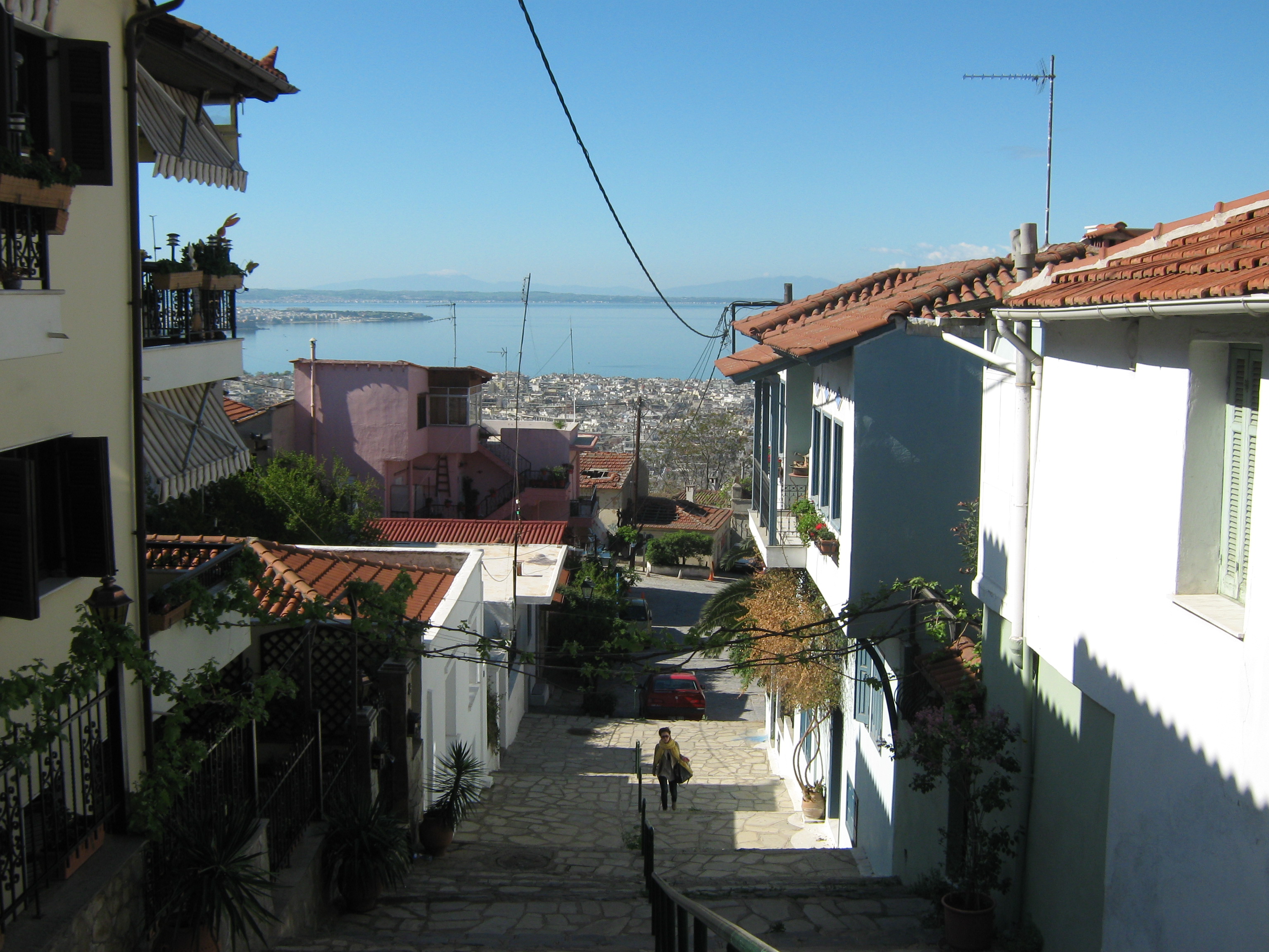 Ωστόσο, αν η οδός Ολυμπιάδος (που χωρίζει σαν ζωνάρι τη σημερινή άνω πόλη από την κάτω) είναι ο σπουδαιότερος οριζόντιος δρόμος, η οδός Δημητρίου Πολιορκητού (που ενώνει την άνω πόλη με την κάτω) είναι ο σπουδαιότερος κάθετος δρόμος. Κάθετος, τρόπος του λέγειν, γιατί στριφογυρίζει γοητευτικά σα φίδι ή σαν ποταμάκι. Αρχίζει πίσω από το διοικητήριο και τελειώνει στη μονή Βλατάδων. Για να τον περπατήσεις, δε φτάνει μισή ώρα, αλλά σίγουρα ο περίπατος αποζημιώνει με το παραπάνω, καθώς τα πολλά γραφικά στενοσόκακα δίνουν μια αυθεντική εικόνα τού πώς ήταν η βυζαντινή και η τουρκοκρατούμενη Θεσσαλονίκη. Βλέποντας τα στριφογυριστά καλντερίμια της άνω πόλης, που διαδέχτηκαν το αρχαίο ορθολογιστικό ιπποδάμειο σύστημα, με τα αυστηρά οικοδομικά τετράγωνα, σκέφτηκα πως, τουλάχιστον σ’ αυτές τις συνοικίες, η ανατολή κατάφερε να ξαναγυρίσει, έστω και σαν στραπατσαρισμένη γραφικότητα, και να επιβιώσει σχεδόν μέχρι σήμερα. Σώζονται λοιπόν αρκετά παλιά σπίτια — τα πιο πολλά, διατηρητέα —, πού και πού κανένα παλιό αρχοντικό, που και μες στην εγκατάλειψή του επιμένει να λάμπει, πολλά προσφυγικά σπιτάκια και καλυβάκια (σε δύο απ’ αυτά μέτρησα την πρόσοψη: δυόμισι μέτρα!), και αρκετά «νεοπαραδοσιακά», που με τον τρόπο τους κι αυτά προσπαθούν να δέσουν με το παλιό περιβάλλον.