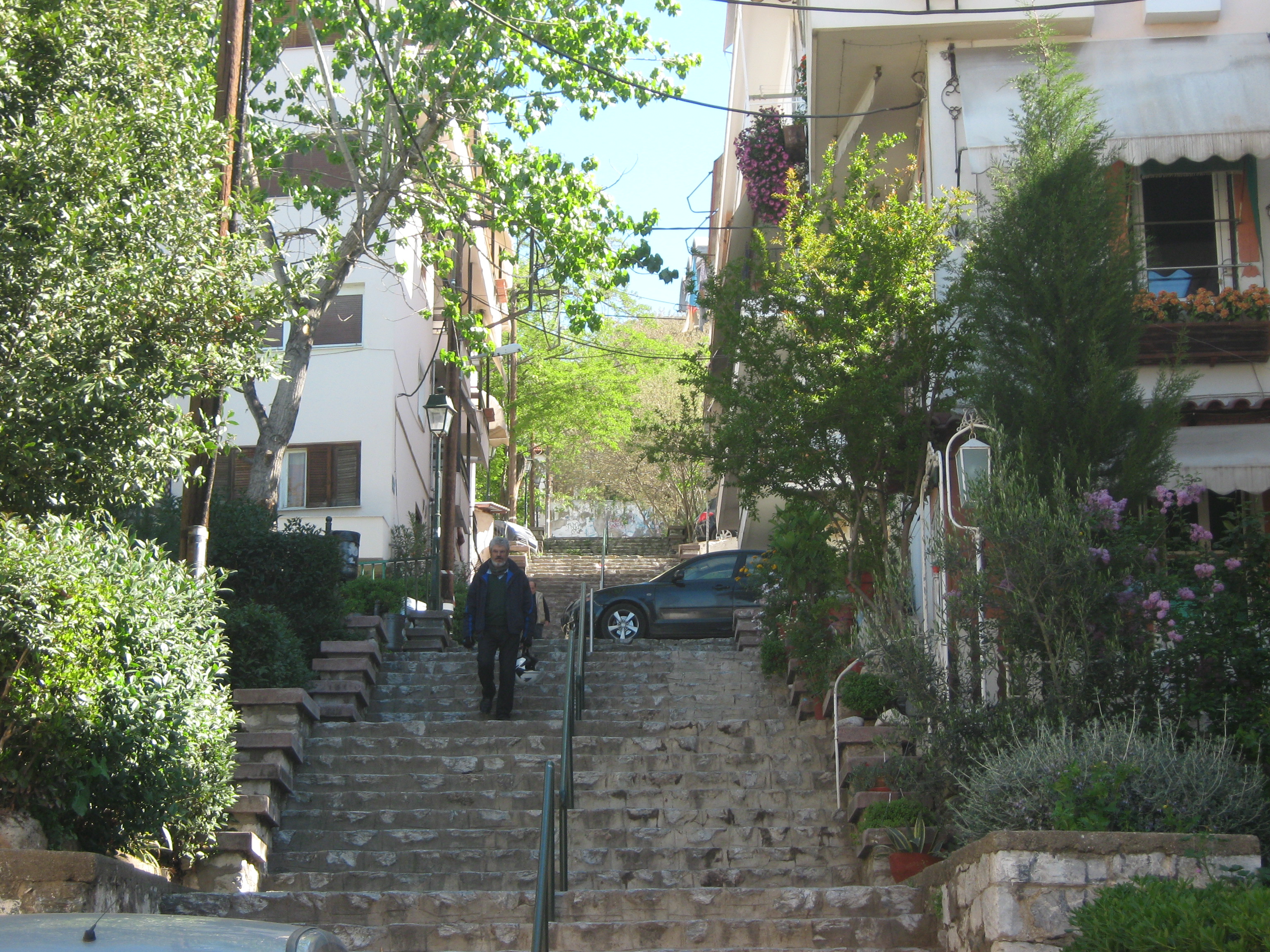Η Δημητρίου Πολιορκητού είναι μια βασική αρτηρία της άνω πόλης. Περνούν τόσο πολλά αυτοκίνητα από έναν τόσο στενό δρόμο, που δεν έχει καν πεζοδρόμιο και οι κυβόλιθοί του είναι πάντα ξεχαρβαλωμένοι, ώστε για να γλιτώσω τους θορύβους και τα καυσαέρια αναγκάστηκα να αποσυρθώ στα πίσω δωμάτια. Επειδή στο σημείο του σπιτιού μου η ανηφόρα γίνεται απότομα πολύ μεγάλη (οι ντόπιοι τη λένε Γολγοθά και δεν έχει ούτε ένα παγκάκι για να ξαποσταίνουν οι γερόντισσες που ανεβαίνουν, κυρίως τις Πέμπτες, από τη λαϊκή αγορά), μια μέρα αγκομαχούσε μπροστά στα παράθυρά μου ένα τεράστιο φορτηγό και ο φορτηγατζής άπλωσε το χέρι και έκοψε δυο τριαντάφυλλα από τις τριανταφυλλιές που είχα στο περβάζι• κι όταν με είδε που τον έβλεπα, μου χαμογέλασε με πολύ θράσος και μου είπε: «Μπέμπη, επιτρέπεται;» Μην έχοντας καμιά διάθεση να με τσουμαδούν κάθε λίγο οι περαστικοί σωφέρηδες, αντικατέστησα τις τριανταφυλλιές με γεράνια, χωρίς ωστόσο να λιγοστέψουν τα σχετικά κρούσματα.