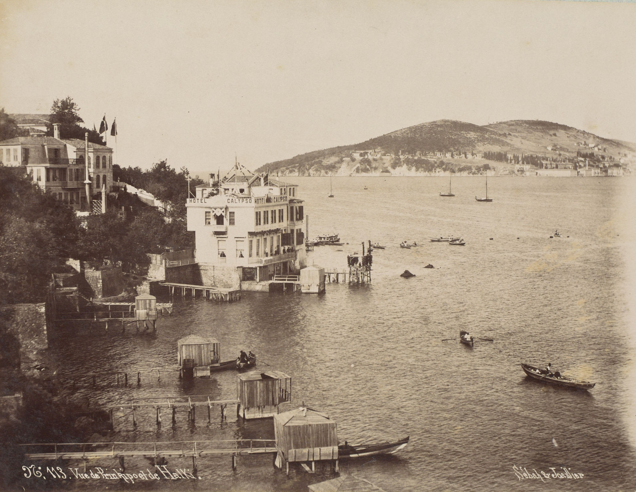 Η ακτή της Πριγκίπου προβάλλει, όπως έρχεται κάνεις από την Κωνσταντινούπολη, με τη μορφή μιας ψηλής όχθης με κοκκινωπά κατσάβραχα, πάνω στην οποία δεσπόζει μια σειρά σπιτιών· ξύλινες κλίμακες ή απότομα μονοπάτια, που διαγράφουν οξείες γωνίες, κατηφορίζουν από τον γκρεμό στη θάλασσα, που πλαισιώνεται από ξύλινες καμπίνες για τους λουόμενους. Μια εκπυρσοκρότηση αναγγέλλει ότι το ατμόπλοιο είναι ενόψει, και αμέσως ένας στόλος από καΐκια και λέμβους ξεκολλάει από την ξηρά για να προϋπαντήσει τους επιβάτες, γιατί η ρηχότητα των νερών δεν επιτρέπει στα πλεούμενα με μεγάλη καρίνα να πλησιάσουν.