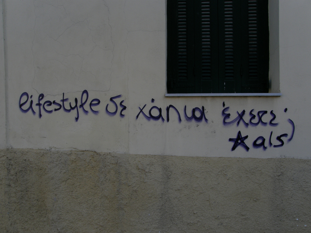 Η αρχική φωτογραφία της ενότητας απεικονίζει, σε αντίθεση με τις αρχικές φωτογραφίες των άλλων ενοτήτων, έναν κλειστό χώρο. Όχι τυχαία. Πρόκειται για την Αθήνα των malls, των τραπεζών, των τοίχων που υψώνονται γύρω από τα σπίτια των βορείων προαστίων. Στην ενότητα αυτή παίρνουμε μια μικρή μονάχα γεύση από έναν συγκεκριμένο τύπο Αθηναίου των 90’s και 00’s. Τρία κείμενα ενδεικτικά μιας εποχής που την χαρακτήρισε το lifestyle και η κυριαρχία του εύκολου και πλαστικού χρήματος. Οι εικόνες από graffiti και συνθήματα μιας άλλης κουλτούρας που τα συνοδεύουν, σχολιάζουν εμπρηστικά αυτόν τον τύπο που κυριάρχησε στη μιντιακή, και όχι μόνο, ζωή του τόπου. Τα βίντεο παρουσιάζουν ανάγλυφα, αν όχι απαραίτητα αυτόν τον Αθηναίο, σίγουρα το περιβάλλον του. Οι στίχοι των τραγουδιών, όπως πάντα, δαγκώνουν μελωδικά.