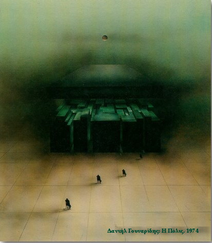 Εκεί, σ’ αυτήν την πόλη, δεν υπήρχανε, μέγαρα πολλά, αλλά λιγοστά, ούτε πλήθος άπειρο να τρέχει σε πλατιούς δρόμους, και ούτε γινόταν ο θόρυβος των τραμ, των αμαξών. Αυτή έμοιαζε με πόλη, που της έχουνε φύγει οι περισσότεροι κάτοικοί της, όπως γίνεται όταν πέφτει κάποια μεγάλη αρρώστια, και είναι σχεδόν έρημη.