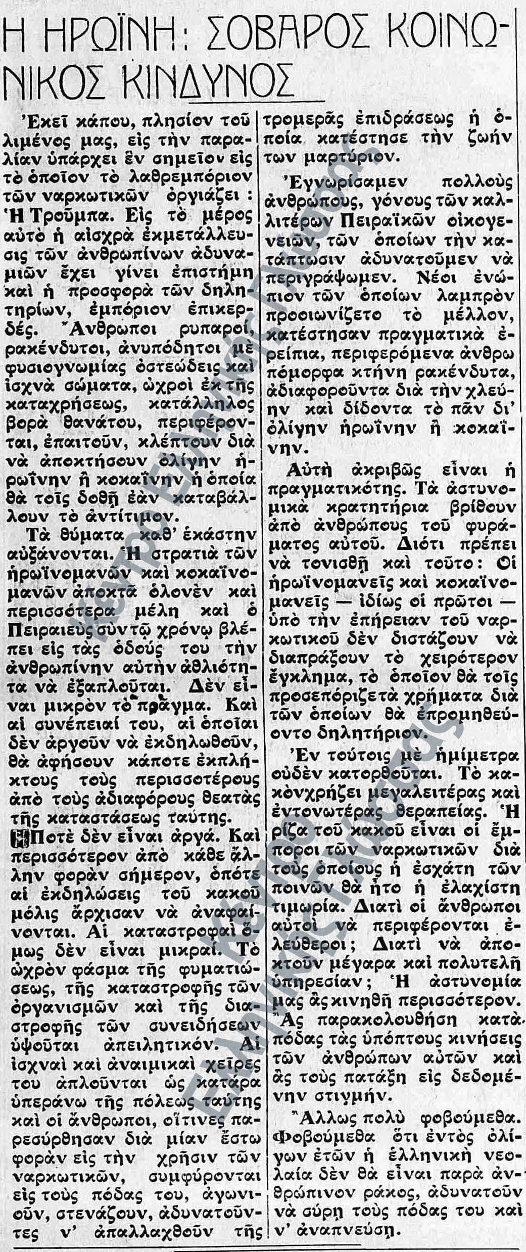 Ξαναβγήκε στο δρόμο χορτάτος, σχεδόν ευτυχισμένος. Ούτε θυμόταν πια τον καβγά με τους βαρκάρηδες και την περιπέτεια με τη μισότρελη – κατά τη γνώμη του – κοπέλα. Ένιωθε όμως πως θα του ήταν αδύνατο να κοιμηθεί, αν δεν μεθούσε πρώτα· κι αν, ύστερα, δεν ερχόταν σε στενότερη επαφή με το γυναικείο φύλο. Όταν λοιπόν έφτασε στην Τρούμπα κι είδε τη φωτεινή επιγραφή «Grand Cabaret International», αναγάλλιασε η ψυχή του.