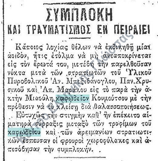 Περάσαμε τη Σκουζέ και στο δεύτερο σπίτι σταθήκαμε. Μια κοντούλα μελαχρινή, σαν το σκουμπρί, τυλιγμένη με το παλτό και ένα παλιό γούνινο καπέλο στο κεφάλι, έδιωχνε τους τελευταίους. «Ξεπούλησα!» φώναζε. Άφοβα, με το θάρρος του παλιού γνωστού, ο Μίμης δρασκέλισε τα σκαλοπάτια και την έπιασε από τη μέση. Του ’σκασε ένα ξινό χαμόγελο και το μάτι της πλανήθηκε ερωτηματικά σε μένα που περίμενα στο δρόμο. Ο Παπαχρυσάνθου μου ’κανε νόημα να μπω.