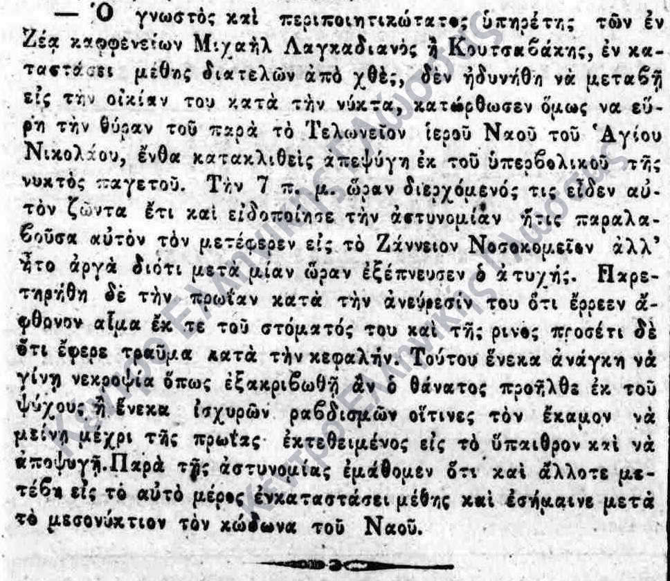 Στα περισσότερα πολιτισμένα έθνη το Τελωνείο είναι ενοχλητικό. Στον Πειραιά και στην Κόρινθο είναι ενοχλητικό, διασκεδαστικό, κωμικό, αρπακτικό, φιλοσοφικό με τόση αδιαντροπιά και καταχρηστικό με τόσο καλή διάθεση, που, απ’ όλους τους υπουργούς που βρέθηκαν στην εξουσία, μόνο ο κ. Τρικούπης είχε το κουράγιο να στείλει στη φυλακή αρκετούς υπαλλήλους, ανακατεμένους με αμέτρητες γελοιότητες.