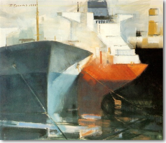 Σώπασαν κι άφησαν τη ματιά τους να περιπλανηθεί σ’ ολόκληρη την έκταση του τοπίου. Μπροστά και χαμηλά ο στενός δίαυλος, ανάμεσα στις ευρυχωριές του Προλιμένα και του Κεντρικού Λιμένα, μισοφραγμένος ζερβόδεξα από τ’ αγκυροβολημένα βαπόρια στου Ξαβέριου και τη Ζώνη. Πιο πίσω, το μακρινάρι από τις δίπατες Αποθήκες, με τις συμμετρικές προεξοχές των γερανών. Αριστερότερα ο ψηλός σταχτόμαυρος κύβος του Σιλό. Πιο πίσω, η πλαγιά της Δραπετσώνας, σκεπασμένη από τα συνωστιζόμενα σπιτάκια του συνοικισμού, με την περήφανη προεξοχή μιας μεγάλης εκκλησιάς στον αυχένα. Κι ακόμη πιο πίσω, ο μισοκλεισμένος από τη σμίξη του Αιγάλεω και της Πάρνηθας ορίζοντας, όπου άρχισαν να σχεδιάζονται τα πρώτα λευκά συννεφάκια του ερχόμενου μελτεμιού.