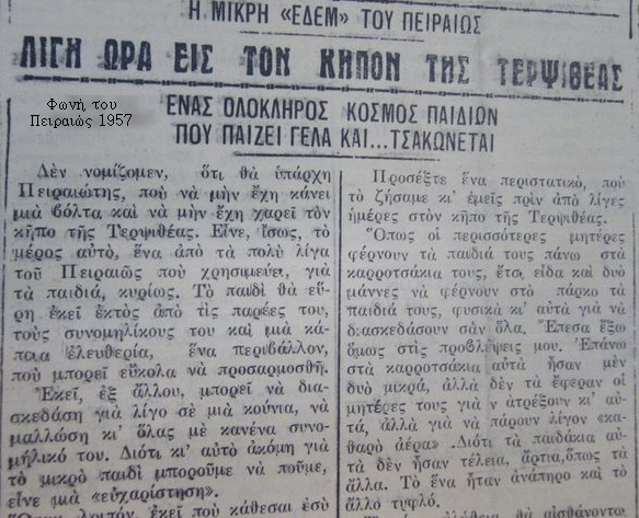 Η διαδρομή μέχρι τους κήπους της Τερψιθέας, τα Περιβολάκια, ήταν δεν ήταν εκατό μέτρα. Όση κι η Περικλέους, δηλαδή. Στο τέρμα της Περικλέους, μετά το καθαριστήριο του Αναγνωστόπουλου και την Ευαγγελική, απλωνότανε η Τερψιθέα. Αυτά τα εκατό μέτρα όμως, δυο κόσμοι ολόκληροι. Μέχρι το διώροφο του Καρκαζή, στα μισά της Περικλέους, ήσουν στον Πειραιά που ήξερες. Σπίτια μ’ ακροκέραμα και μπρούτζινα ρόπτρα, μπαλκόνια με μαντεμένιες σιδεριές που δείχνανε μούσες κι αγγελάκια και μπιγκόνιες ίσαμε δυο μέτρα ψηλές στις γλάστρες. Μύριζε τ’ αρχοντιλίκι, η νοικοκυροσύνη, η κάποια τάξη, βρε αδερφέ… Εντάξει δε λέω, δεν έτρεχε ποτάμι ο παράς, αλλά τον είχε ο καθένας – άλλος λίγο, άλλος πολύ- τον τρόπο του να πορευτεί. Και στου Βονόρτα να πάει για το τρινάλ και τον πελτέ και στου Αργυρίου να κατέβει για τη φέτα και το κασέρι και απ’ του Διακοδημήτρη να πάρει τη μορταδέλα και τον παστουρμά του. Και τον καφέ στο καφενείο να τον πιει και στο σινεμαδάκι του να πάει και ν’ αγοράσει λουστρίνια τα Χριστούγεννα και πέδιλα το Πάσχα για τα παιδιά. τα φέρναν βόλτα μια φορά και πλήρωναν κανονικά το νοίκι, εκτός από την Πιλάλη, την Κυριακού, τον Καρκαζή, τη Νομικού, που ‘ταν δικά τους και μένανε στον πάνω και νοίκιαζαν το ισόγειο.