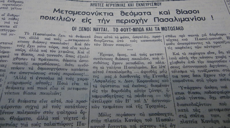 Παίζουμε ποδοσφαιράκι στα υπόγεια σφαιριστήρια του Σιδέρη στο Πασαλιμάνι, με τον Κατερινιό να χαϊδεύει συνέχει τη μαύρη αλογίσια φράντζα του, νευρώδης και επικίνδυνος, όταν κάποιος φωνάζει «Ρε σεις, μου κλέψανε το πορτοφόλι». Ο Σιδέρης αγρίεψε, «Δε φεύγει κανείς από δω αν δε βρεθεί το πορτοφόλι», κλείσανε τις πόρτες, ήρθε η αστυνομία και βρεθήκαμε πέντε έξι με συνοδεία δυο αστυνομικών να διασχίζουμε τους δρόμους του Πειραιά καθ’ οδόν για την Ασφάλεια. Ο Κατερινιός δίπλα και πίσω μου ψιθυρίζει. «Είμαι σταμπαρισμένος, βγάλε με απ’ τη δύσκολη με το φόλι και θα σ’ το χρωστάω», ενώ μου χώνει με τρόπο στην τσέπη το σώμα του εγκλήματος. Δεν πρέπει να πανικοβληθώ, ψυχραιμία, για ν’ απαλλαγώ από δαύτο το συντομότερο, το χώνω στο πρώτο καλάθι απορριμμάτων του Δήμου Πειραιά, που μου προσφέρεται βολικά στημένο πάνω σ’ ένα στύλο της δεη. Πετώντας απ’ το ξαλάφρωμα, ανεβαίνω αεράτος τα σκαλιά της Ασφάλειας μαζί με τους άλλους.