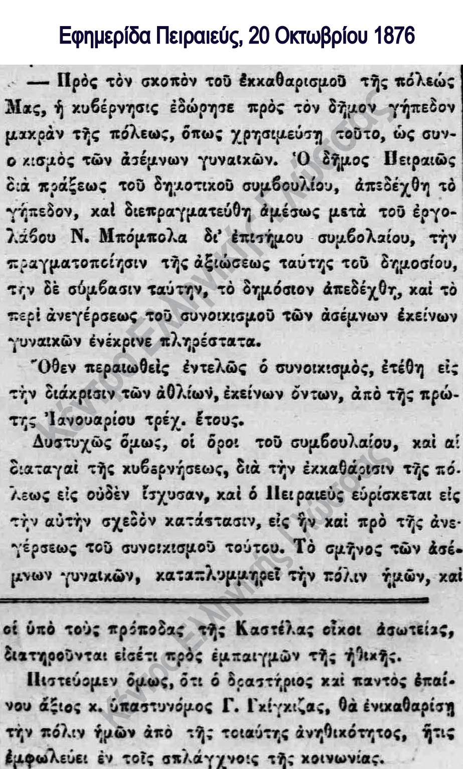 Ο χώρος, απέραντος, που νοίκιαζε το κράτος, ανήκε, ως έμαθα, στον τέως υπουργό Πιπινέλη. Και οι γυναίκες πάλι πλήρωναν το νοίκι τους. Είχε γύρω-γύρω τείχη και τον φρουρούσαν. Οι πόρτες ανοίγανε στις 9 το πρωί και κλείνανε τα μεσάνυχτα. Τις γυναίκες που μαζεύονταν εκεί, τις είχε πιάσει η αστυνομία δίχως άδεια εξασκήσεως επαγγέλματος κι ήταν άρρωστες. Τις στέλναν πρώτα στου Συγγρού να θεραπευτούν από τ’ αφροδίσια νοσήματα. Κατόπι κλείνονταν στα Βούρλα και δεν μπορούσαν δίχως άδεια ποτέ να βγουν από το φρούριο. Η αστυνομία είχε καθήκον να τις επιτηρεί και να τις προστατεύει, εάν οι πελάτες τις δέρναν ή εάν γίνονταν καυγάδες αναμεταξύ τους. Υπήρχε για τις γυναίκες αυτές ιατρική παρακολούθηση και κάποια περίθαλψη.