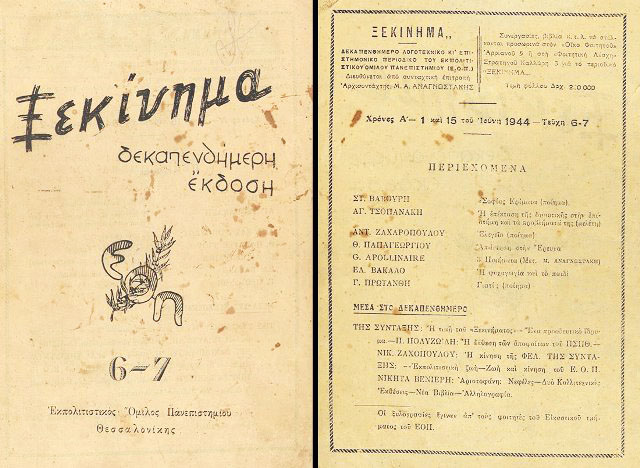 Το κλίμα του νεορομαντισμού και του νεοσυμβολισμού επιμένει και σε ποιήματα που δημοσιεύει τα επόμενα χρόνια. Φοιτητής πια, μέλος της ΕΠΟΝ και αρχισυντάκτης του φοιτητικού περιοδικού Ξεκίνημα (που βγάζει με συντρόφους του όπως ο Κλ. Κύρου, ο Θ. Φωτιάδης, ο Π. Θασίτης κ.ά.), θα δημοσιεύσει σε αυτό το πρώτο του νεοτερικό, σε ελεύθερο πια στίχο, ποίημα με τίτλο «Απροσδιόριστη χρονολογία» (Ξεκίνημα, αρ. 3, 20 του Μάρτη 1944). Στο περιοδικό Νεανική Φωνή δημοσιεύει το «Ιστορία», ποίημα που δεν θα εντάξει αργότερα σε καμία από τις συλλογές του. Ποιήματα δημοσιεύει και στο περιοδικό Ελεύθερα Γράμματα (1945-1951).